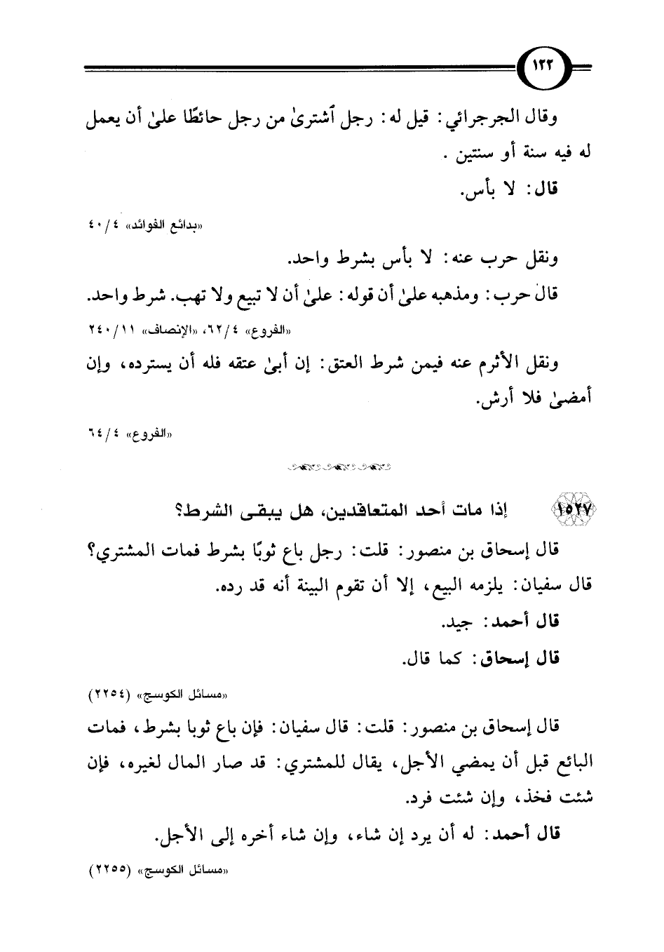 قال إسحاق بن منصور: قلت: قال سفيان: فإن باع ثوبا بشرط، فمات البائع قبل أن يمضي الأجل، يقال للمشتري: قد صار المال لغيره، فإن شئت فخذ، وإن شئت فرد.
