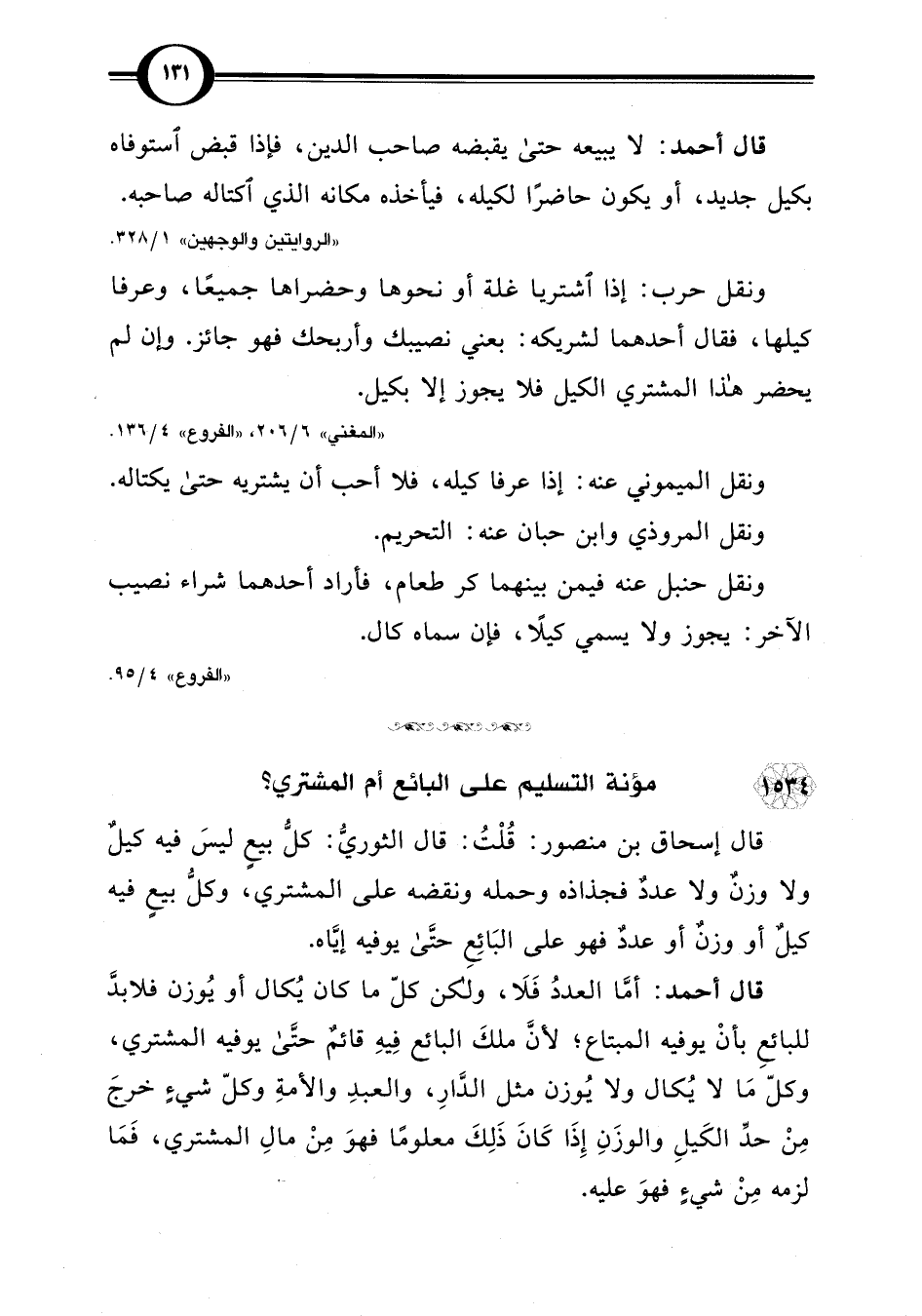قال أحمد: أمَّا العددُ فَلَا، ولكن كلّ ما كان يُكال أو يُوزن فلابدَّ للبائعِ بأنْ يوفيه المبتاع؛ لأنَّ ملكَ البائع فِيهِ قائمٌ حتَّى يوفيه المشتري، وكلّ مَا لا يُكال ولا يُوزن مثل الدَّارِ، والعبدِ والأمةِ وكلّ شيءٍ خرجَ مِنْ حدِّ الكَيا والوزَنِ إِذَا كَانَ ذَلِكَ معلومًا فهوَ مِنْ مالِ المشتري، فَمَا لزمه مِنْ شيءٍ فهوَ عليه.