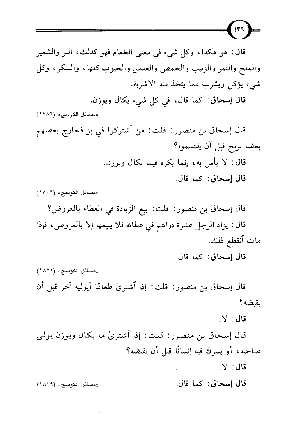 قال إسحاق بن منصور: قلت: إذا اشترى ما يكال ويوزن يولى صاحبه، أو يشرك فيه إنسانًا قبل أن يقبضه؟