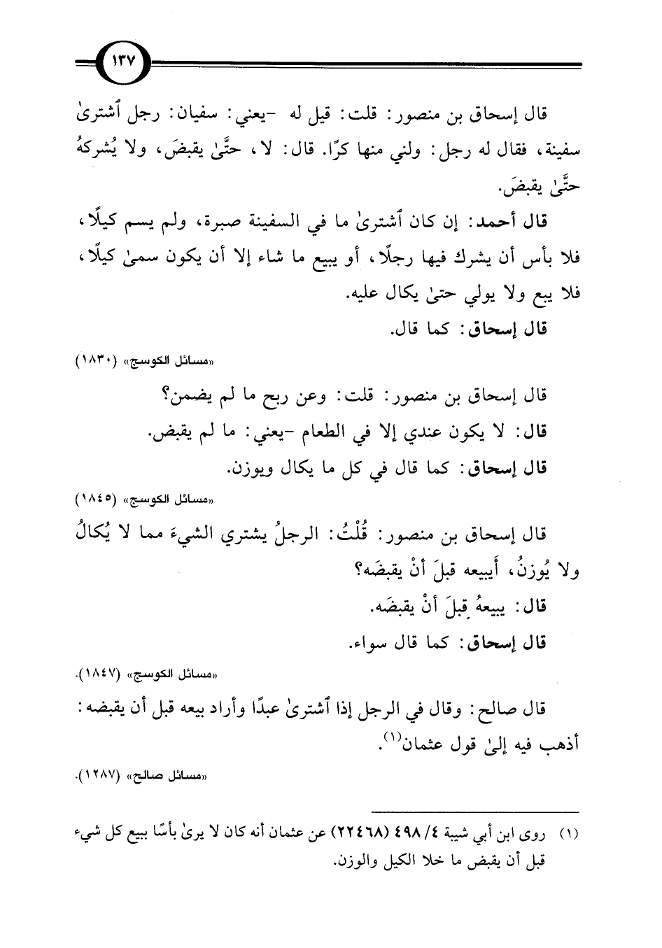 قال إسحاق بن منصور: قلت: قيل له -يعني: سفيان: رجل اشترى سفينة، فقال له رجل: ولني منها كرًا. قال: لا، حتَّى يقبضَ، ولا يُشركهُ حتَّى يقبضَ.