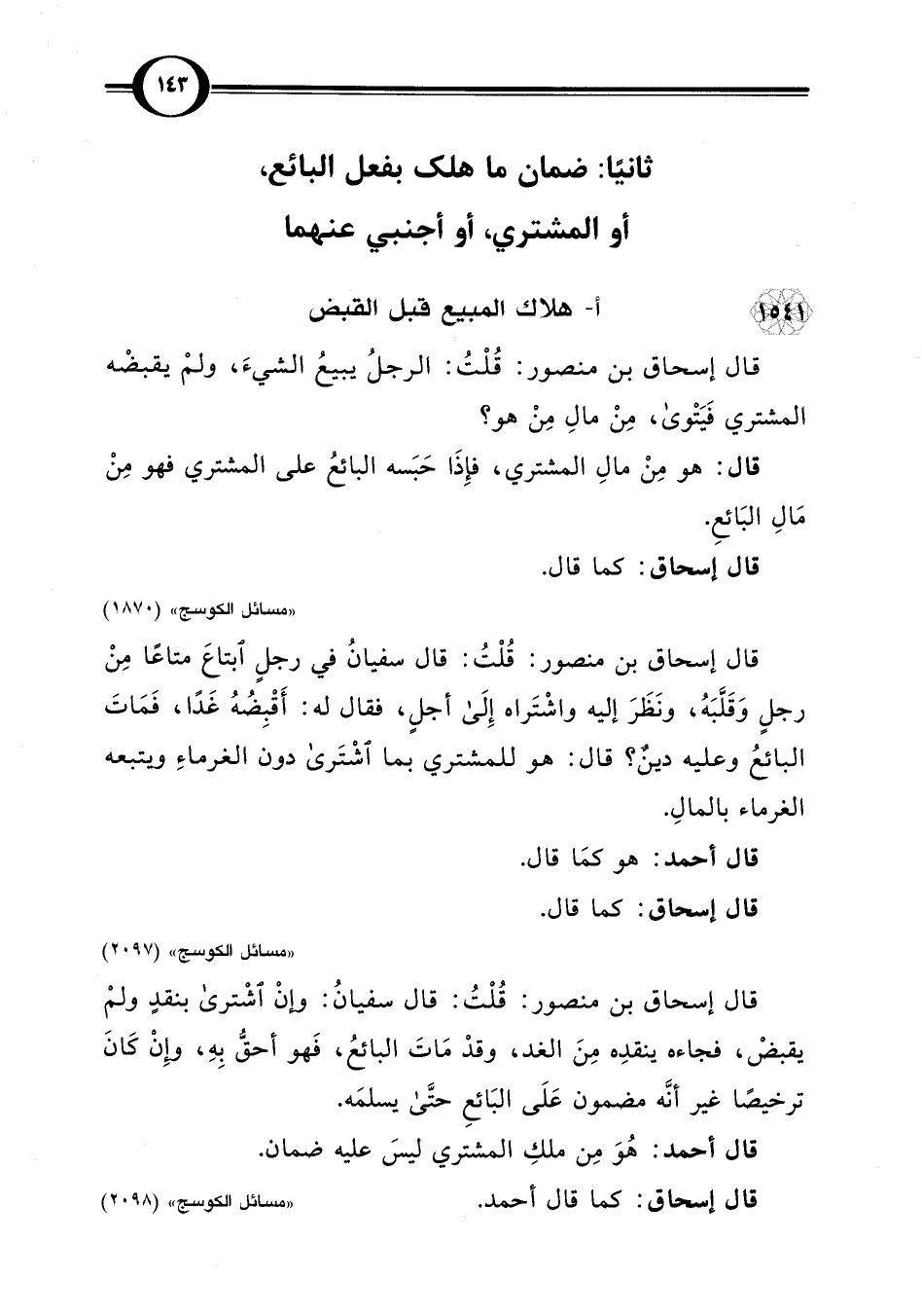 قال إسحاق بن منصور: قُلْتُ: الرجلُ يبيعُ الشيءَ، ولمْ يقبضْه المشتري فَيَتْوى، مِنْ مالِ مِنْ هو؟