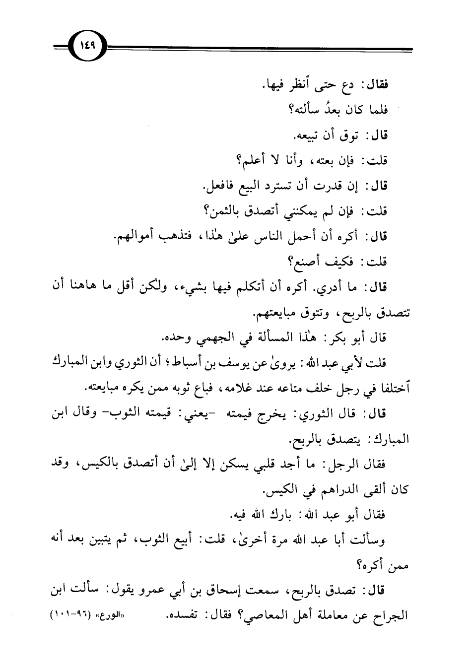 قال: تصدق بالربح، سمعت إسحاق بن أبي عمرو يقول: سألت ابن الجراح عن معاملة أهل المعاصي؟ فقال: تفسده.