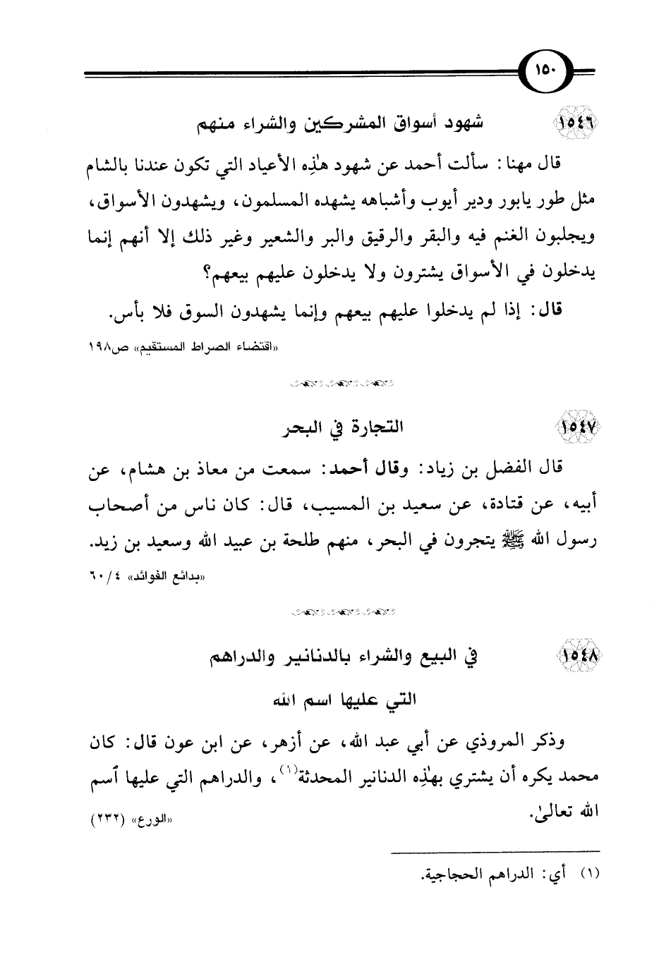 قال الفضل بن زياد: وقال أحمد: سمعت من معاذ بن هشام، عن أبيه، عن قتادة، عن سعيد بن المسيب، قال: كان ناس من أصحاب رسول اللَّه -صلى اللَّه عليه وسلم- يتجرون في البحر، منهم طلحة بن عبيد اللَّه وسعيد بن زيد.