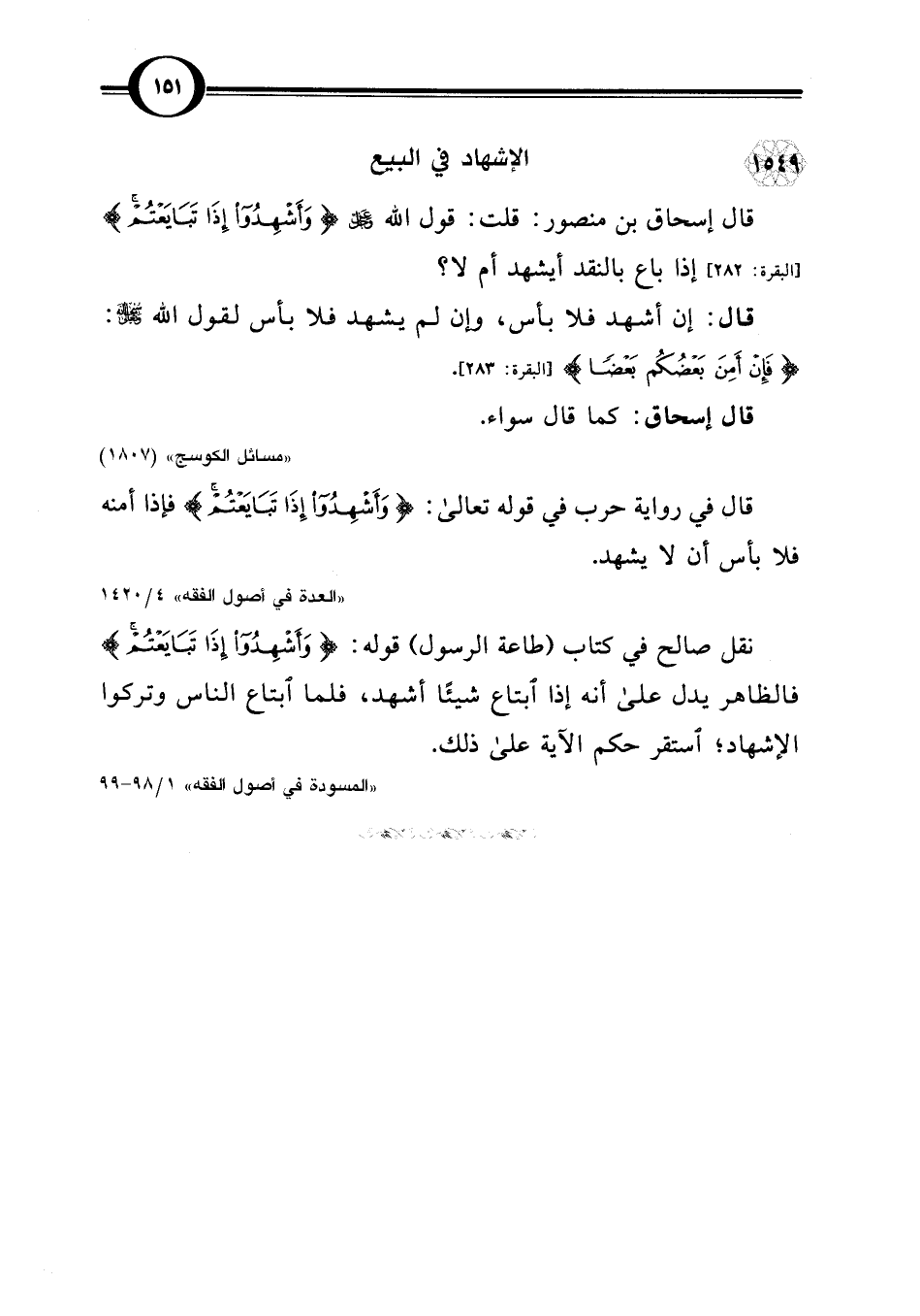 قال إسحاق بن منصور: قلت: قول اللَّه عَزَّ وَجَلَّ {وَأَشْهِدُوا إِذَا تَبَايَعْتُمْ} [البقرة: 282]، إذا باع بالنقد أيشهد أم لا؟