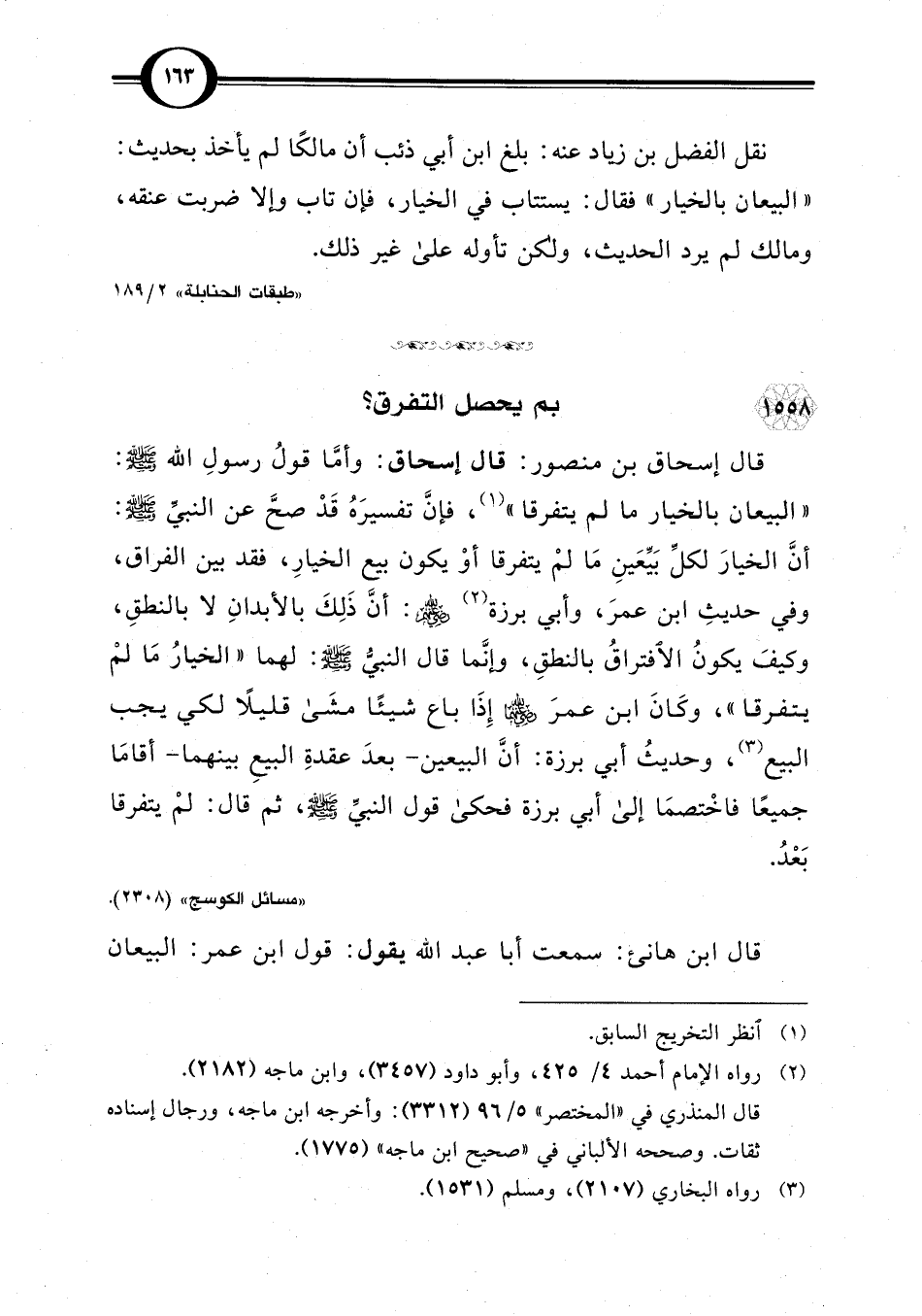قال إسحاق بن منصور: قال إسحاق: وأمَّا قولُ رسولِ اللَّه -صلى اللَّه عليه وسلم-: "البيعان بالخيار ما لم يتفرقا" (¬1)، فإنَّ تفسيرَهُ قَدْ صحَّ عن النبيّ -صلى اللَّه عليه وسلم-: أنَّ الخيارَ لكلِّ بَيِّعَينِ مَا لمْ يتفرقا أوْ يكون بيع الخيارِ، فقد بين الفراق، وفي حديثِ ابن عمرَ، وأبي برزة (¬2) -رضي اللَّه عنهم-: أنَّ ذَلِكَ بالأبدانِ لا بالنطقِ، وكيفَ يكونُ الافتراقُ بالنطقِ، وإنَّما قال النبي -صلى اللَّه عليه وسلم-: لهما "الخيارُ مَا لمْ يتفرقا"، وكَانَ ابن عمرَ -رضي اللَّه عنهما- إِذَا باع شيئًا مشَى قليلًا لكي يجب البيع (¬3)، وحديثُ أبي برزة: أنَّ البيعين -بعدَ عقدةِ البيعِ بينهما- أقامَا جميعًا فاخْتصمَا إلى أبي برزة فحكى قول النبيِّ صلى اللَّه عليه وسلم، ثم قال: لمْ يتفرقا بَعْدُ.