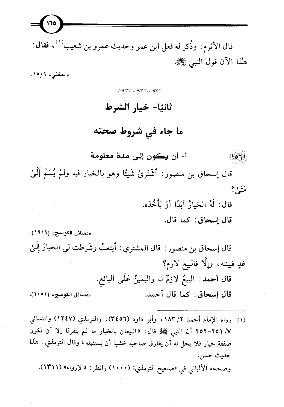 قال إسحاق بن منصور: اشْتَرى شَيئًا وهو بالخيار فيه ولمْ يُسَمِّ إلَى مَتَى؟