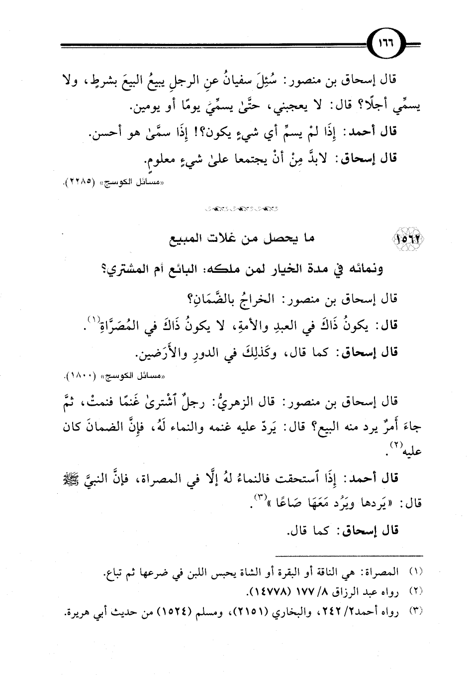 قال إسحاق بن منصور: قال الزهريُّ: رجلٌ اشْترى غَنمًا فنمتْ، ثُمَّ جاءَ أَمرٌ يرد منه البيع؟ قال: يَردّ عليه غنمه والنماء لَهُ، فإِنَّ الضمانَ كان عليه (¬2).