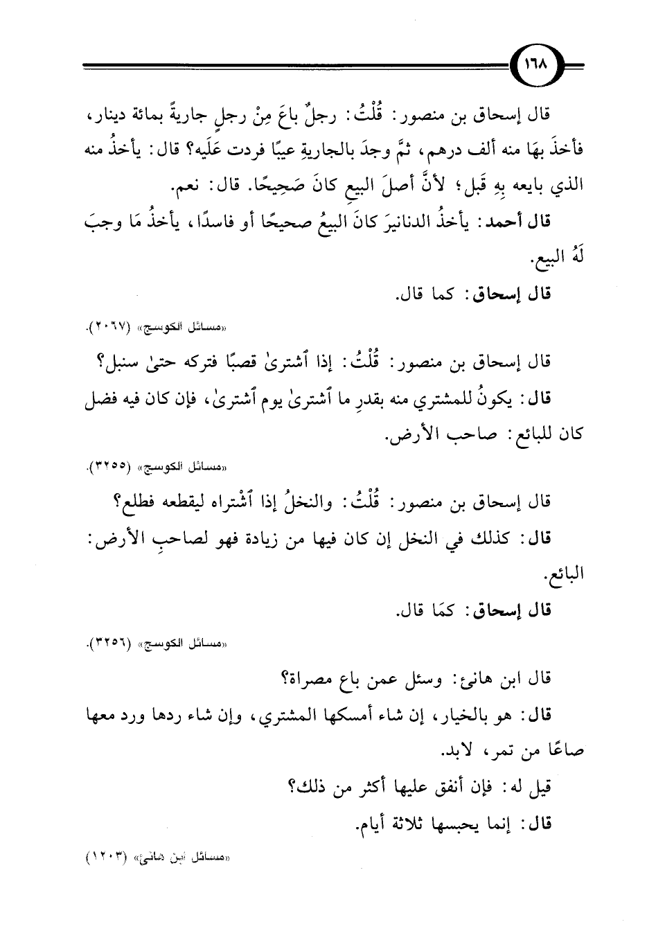قال إسحاق بن منصور: قُلْتُ: رجلٌ باعَ مِنْ رجلٍ جاريةً بمائة دينار، فأخذَ بهَا منه ألف درهم، ثمَّ وجدَ بالجاريةِ عيبًا فردت عَلَيه؟ قال: يأخذُ منه الذي بايعه بِهِ قَبل؛ لأنَّ أصلَ البيعِ كانَ صَحِيحًا. قال: نعم.