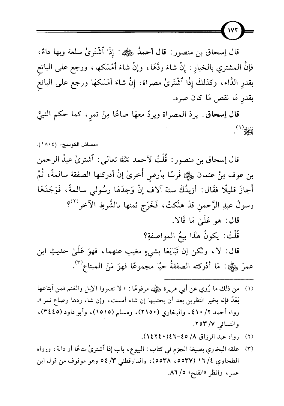 قال إسحاق بن منصور: قُلْتُ لأحمد رحمه اللَّه تعالى: اشترى عبدُ الرحمن بن عوف مِنْ عثمان -رضي اللَّه عنهما- فَرسًا بأرضٍ أُخرى إنْ أدركتها الصفقة سالمةً، ثُمَّ أَجازَ قليلًا فقَال: أزيدُكَ ستة آلاف إنْ وَجدَهَا رسُولي سالمةً، فَوَجَدَهَا رسولُ عبدِ الرَّحمنِ قدْ هلَكتْ، فَخَرَج ثمنها بالشَّرطِ الآخر (¬2)؟