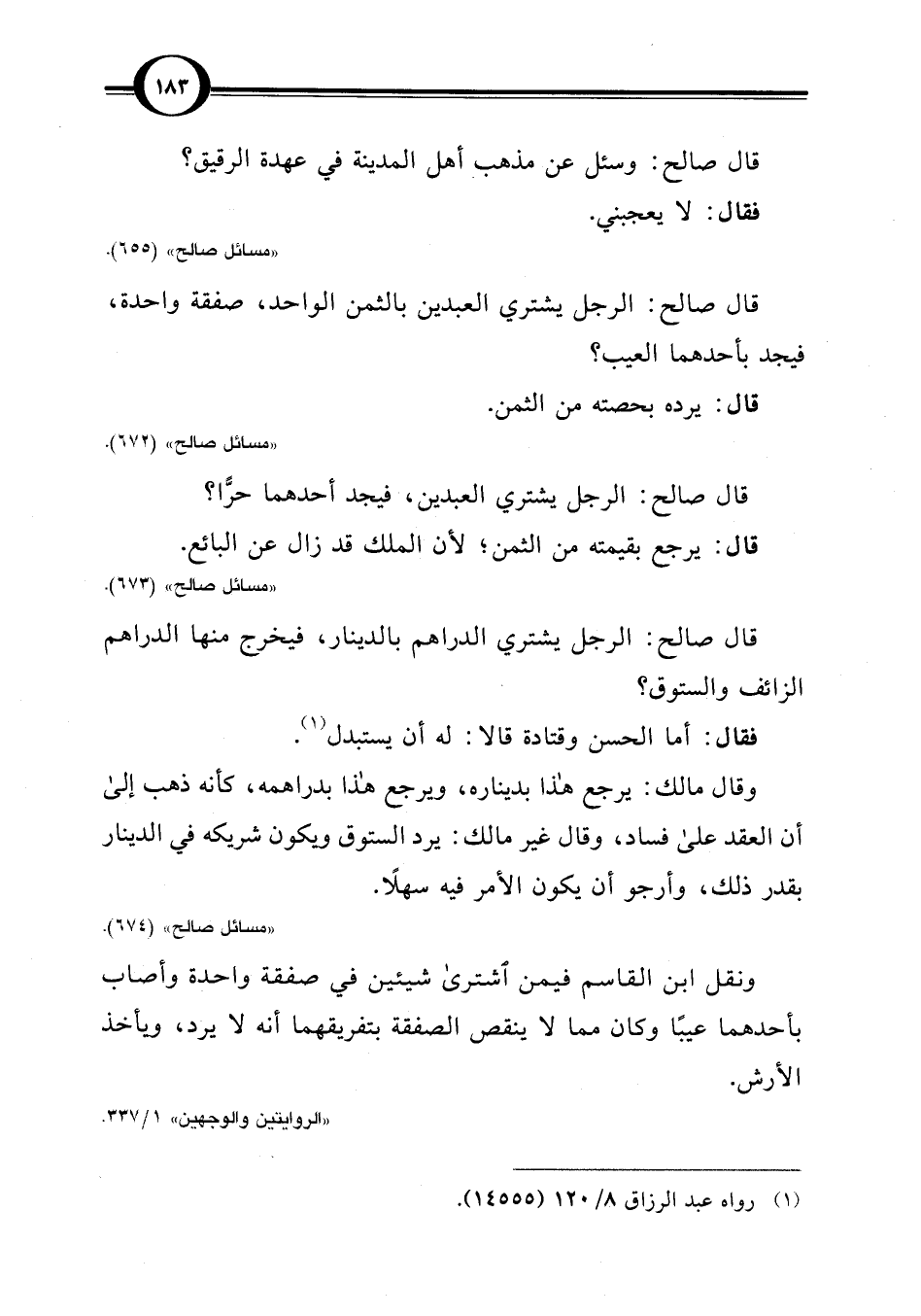 قال صالح: وسئل عن مذهب أهل المدينة في عهدة الرقيق؟