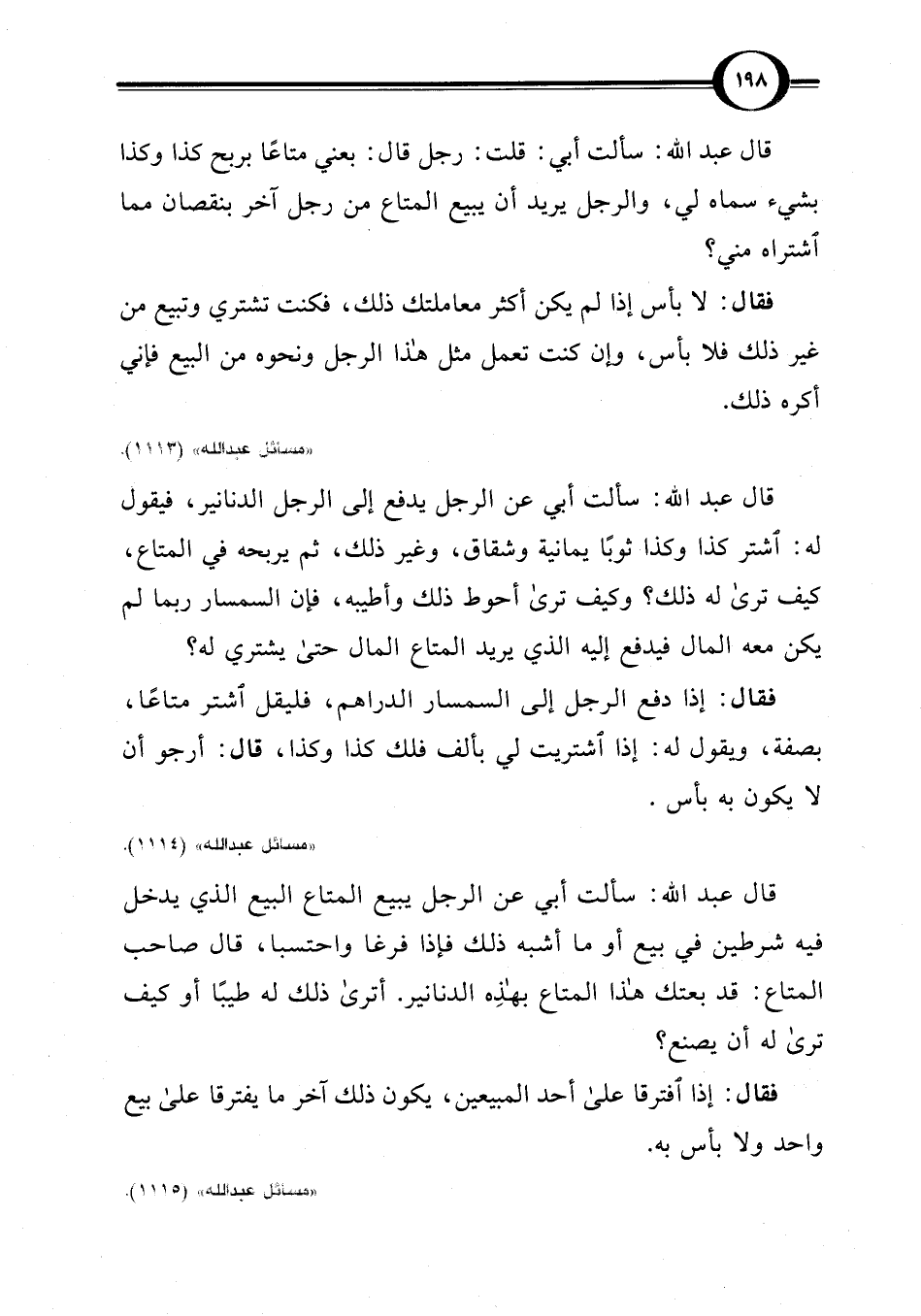 قال عبد اللَّه: سألت أبي عن الرجل يبيع المتاع البيع الذي يدخل فيه شرطين في بيع أو ما أشبه ذلك فإذا فرغا واحتسبا، قال صاحب المتاع: قد بعتك هذا المتاع بهذِه الدنانير. أترى ذلك له طيبًا أو كيف ترى له أن يصنع؟