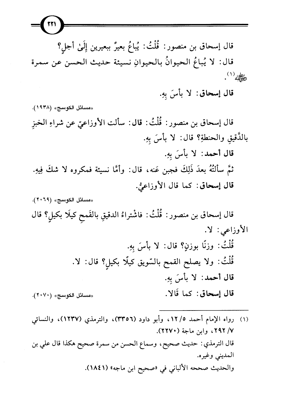 قال إسحاق بن منصور: قُلْتُ: يُباعُ بعيرٌ ببعيرين إِلَى أجل؟
