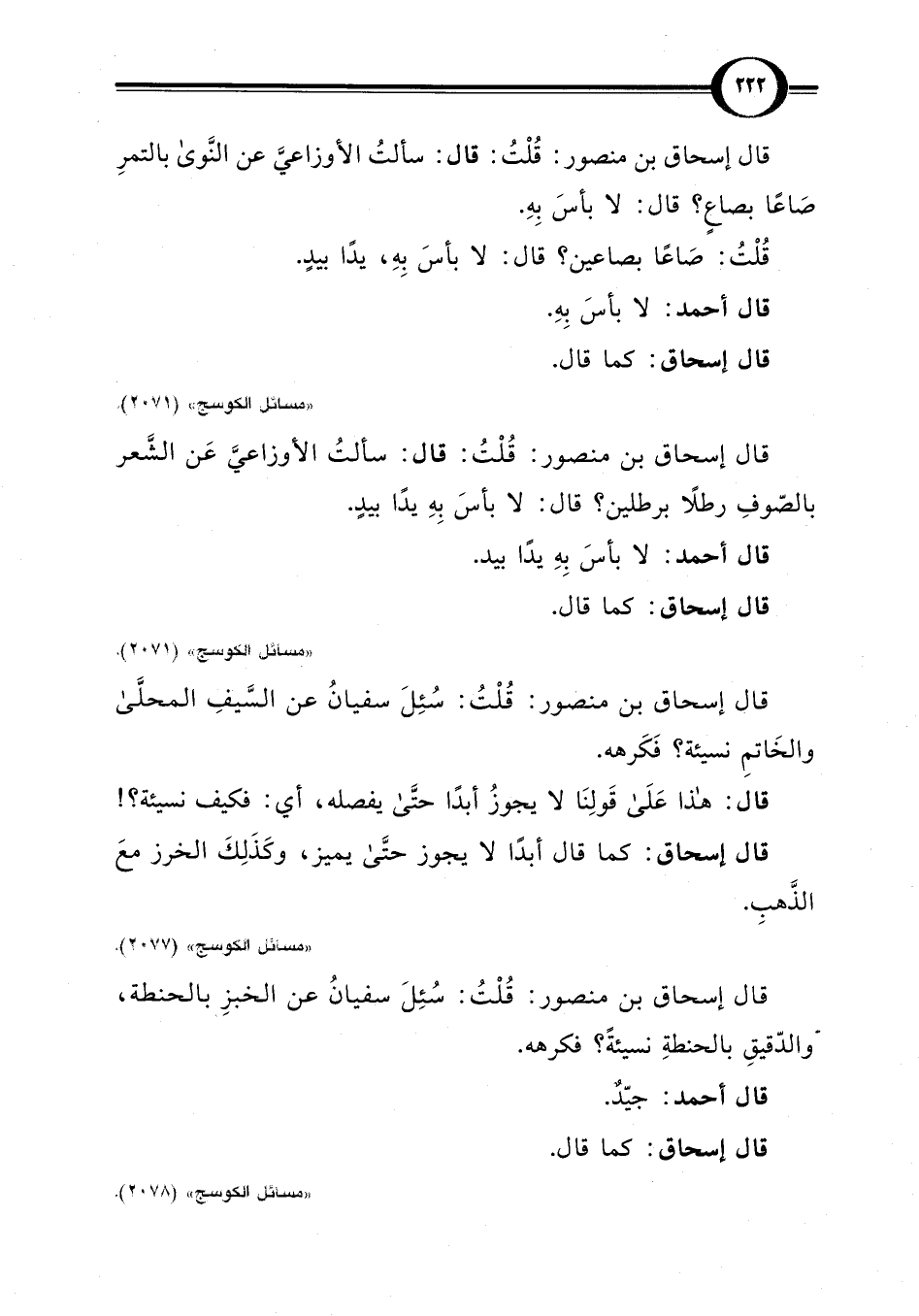 قال إسحاق بن منصور: قُلْتُ: قال: سألتُ الأوزاعيَّ عَن الشَّعر بالصّوفِ رطلًا برطلين؟ قال: لا بأسَ بِهِ يدًا بيدٍ.