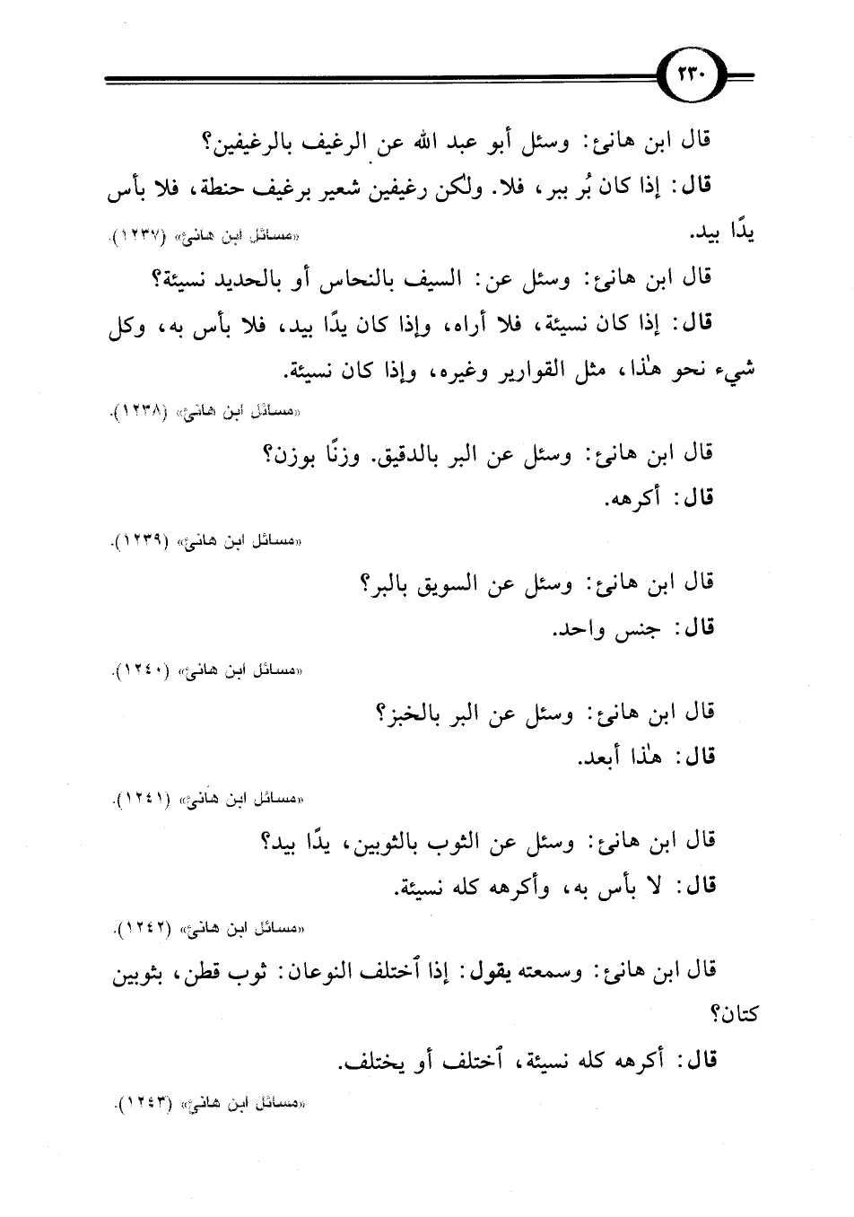 قال ابن هانئ: وسئل عن: السيف بالنحاس أو بالحديد نسيئة؟
