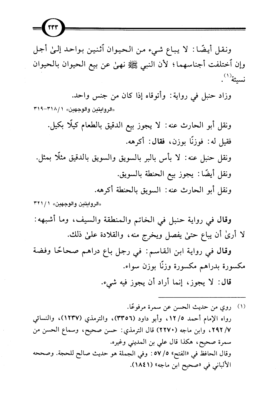 ونقل أيضًا: لا يباع شيء من الحيوان اثنين بواحد إلى أجل وإن اختلفت أجناسهما؛ لأن النبي -صلى اللَّه عليه وسلم- نهى عن بيع الحيوان بالحيوان نسيئة (¬1).