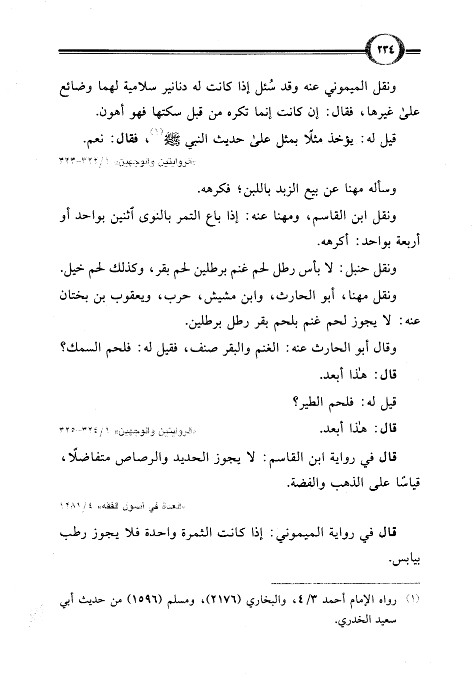 ونقل مهنا، أبو الحارث، وابن مشيش، حرب، ويعقوب بن بختان عنه: لا يجوز لحم غنم بلحم بقر رطل برطلين.