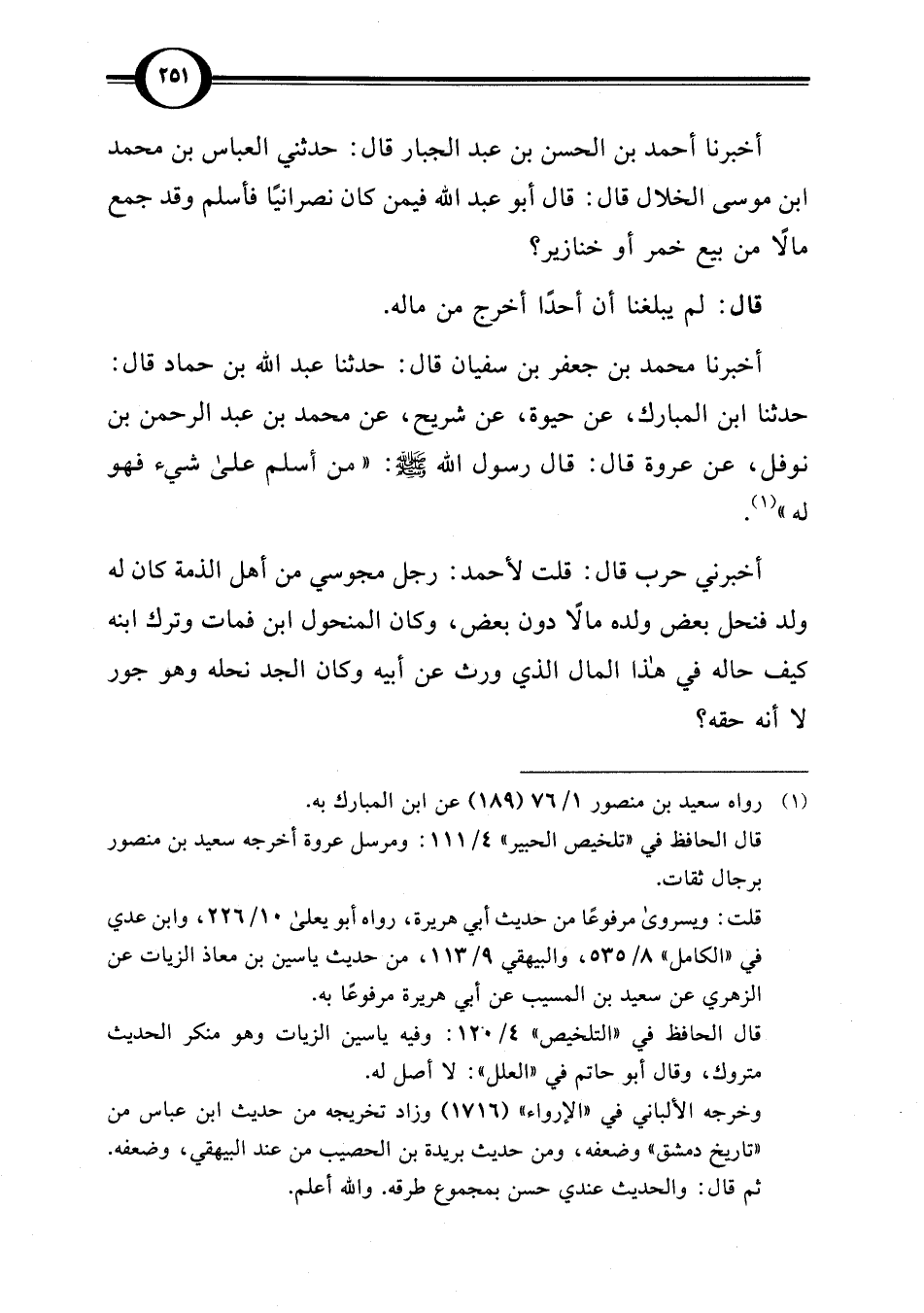 أخبرنا أحمد بن الحسن بن عبد الجبار قال: حدثني العباس بن محمد ابن موسى الخلال قال: قال أبو عبد اللَّه فيمن كان نصرانيًا فأسلم وقد جمع مالًا من بيع خمر أو خنازير؟