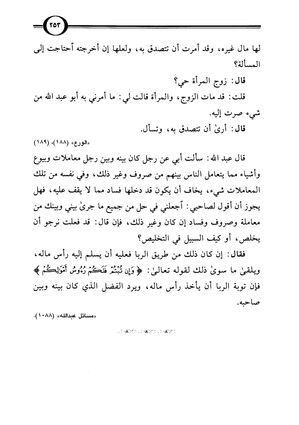 قال عبد اللَّه: سألت أبي عن رجل كان بينه وبين رجل معاملات وبيوع وأشياء مما يتعامل الناس بينهم من صروف وغير ذلك، وفي نفسه من تلك المعاملات شيء، يخاف أن يكون قد دخلها فساد مما لا يقف عليه، فهل يجوز أن أقول لصاحبي: اجعلني في حل من جميع ما جرى بيني وبينك من معاملة وصروف وفساد إن كان وغير ذلك، فإن قال: قد فعلت نرجو أن يخلص، أو كيف السبيل في التخليص؟