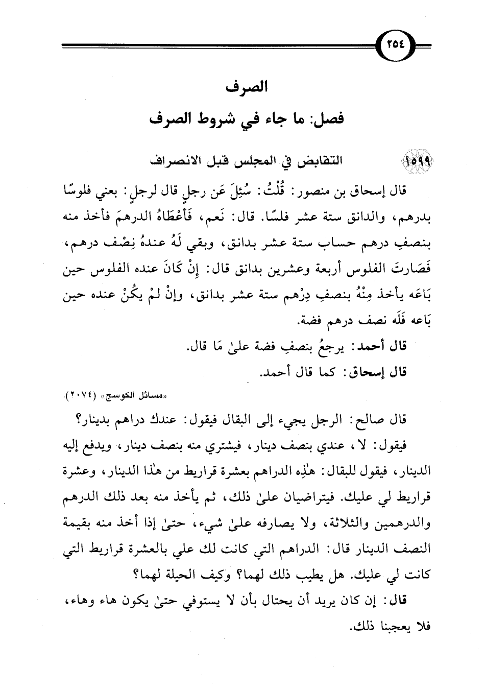 قال إسحاق بن منصور: قُلْتُ: سُئِلَ عَن رجلٍ قال لرجلٍ: بعني فلوسًا بدرهم، والدانق ستة عشر فلا. قال: نَعم، فَأعْطَاهُ الدرهمَ فأخذ منه بنصفِ درهم حساب ستة عشر بدانق، وبقي لَهُ عندهُ نِصْف درهم، فَصَارتَ الفلوس أربعة وعشرين بدانق قال: إِنْ كَانَ عنده الفلوس حين بَاعَه يأخذ مِنْهُ بنصفِ دِرْهم ستة عشر بدانق، وإنْ لمْ يكُنْ عنده حين بَاعه فَلَه نصف درهم فضة.