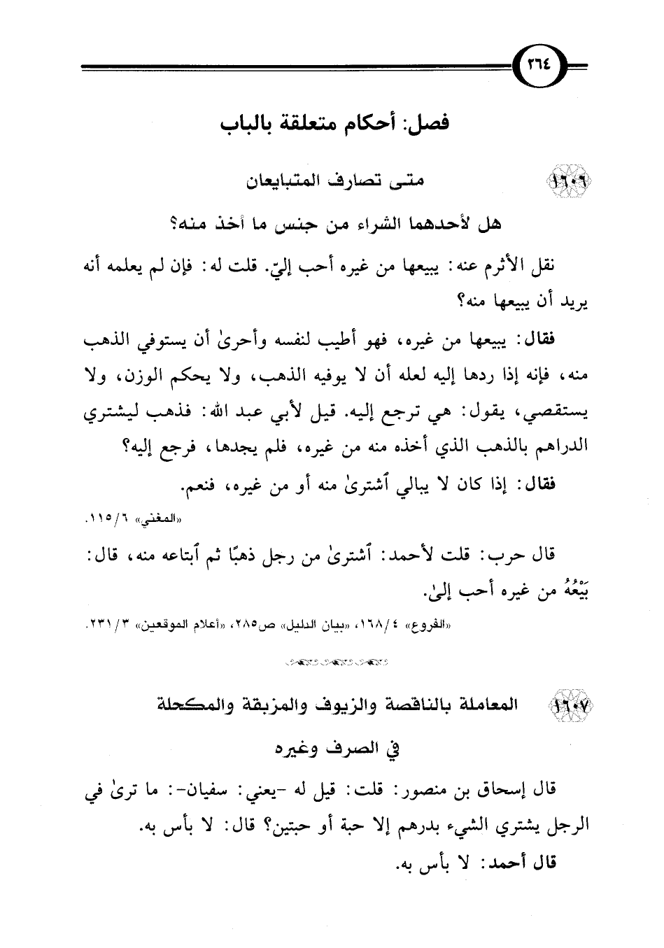 قال حرب: قلت لأحمد: اشترى من رجل ذهبًا ثم ابتاعه منه، قال: بَيْعُهُ من غيره أحب إلى.