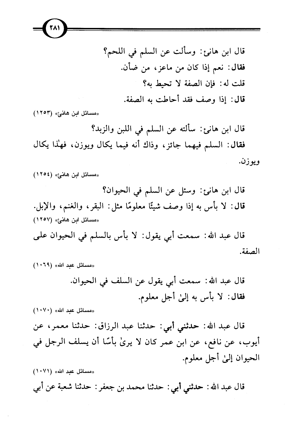 قال عبد اللَّه: سمعت أبي يقول: لا بأس بالسلم في الحيوان على الصفة.