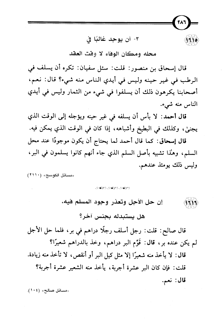 قال صالح: قلت: رجل أسلف رجلًا دراهم في بر، فلما حل الأجل لم يكن عنده بر، قال: قَوِّم البر دراهم، وخذ بالدراهم شعيرًا؟