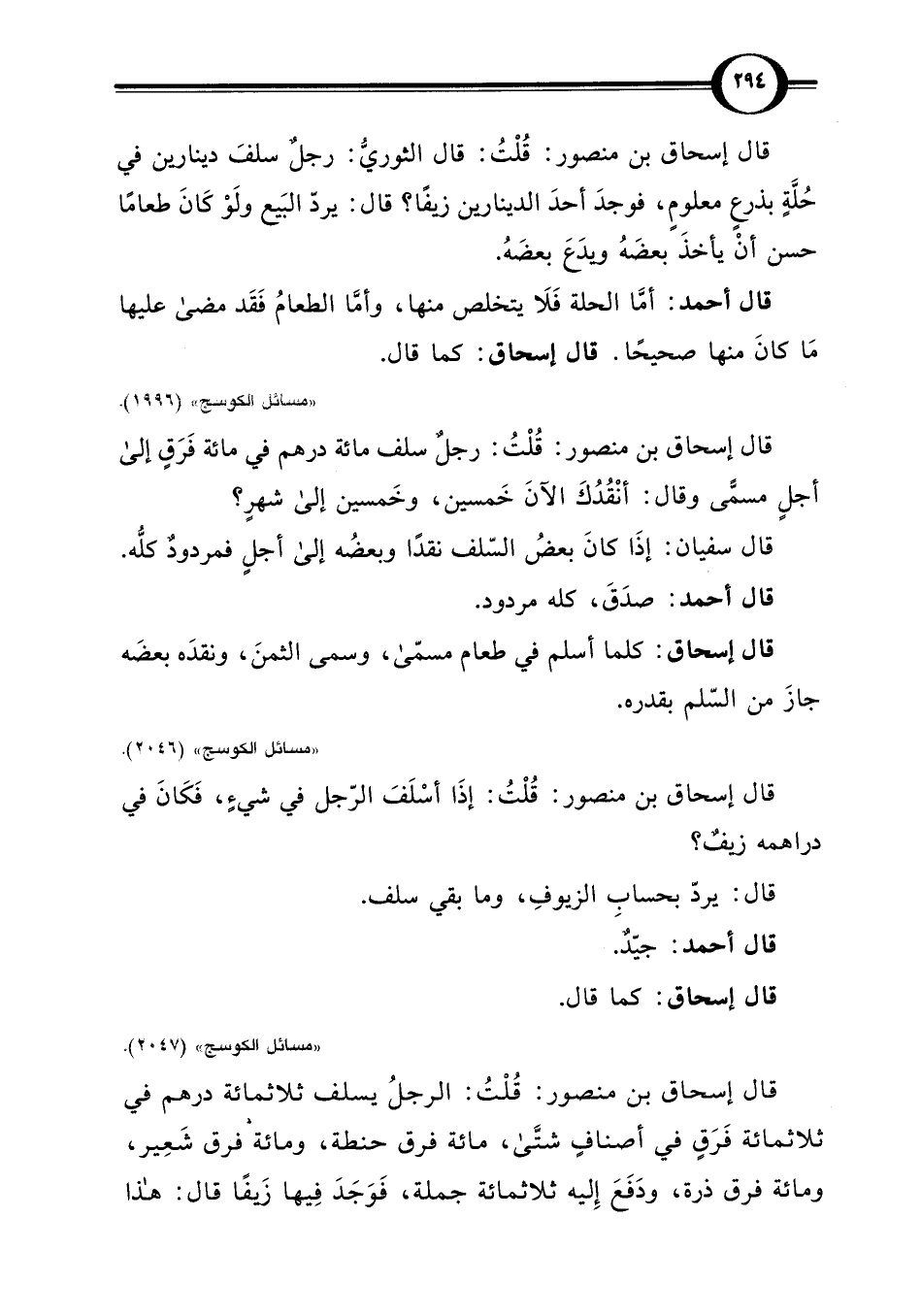 قال إسحاق بن منصور: قُلْتُ: الرجلُ يسلف ثلاثمائة درهم في ثلاثمائة فَرَقٍ في أصنافٍ شتَّى، مائة فرق حنطة، ومائة فرق شَعِير، ومائة فرق ذرة، ودَفَعَ إِليه ثلاثمائة جملة، فَوَجَدَ فِيها زَيفًا قال: هذا