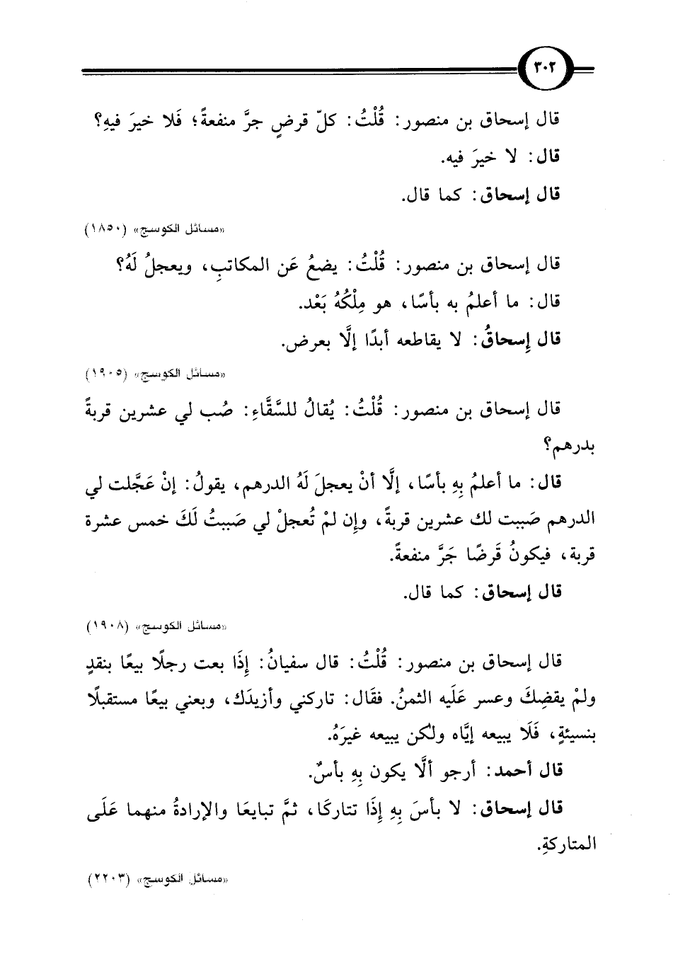 قال إسحاق بن منصور: قُلْتُ: كلّ قرضٍ جرَّ منفعةً؛ فَلا خيرَ فيهِ؟