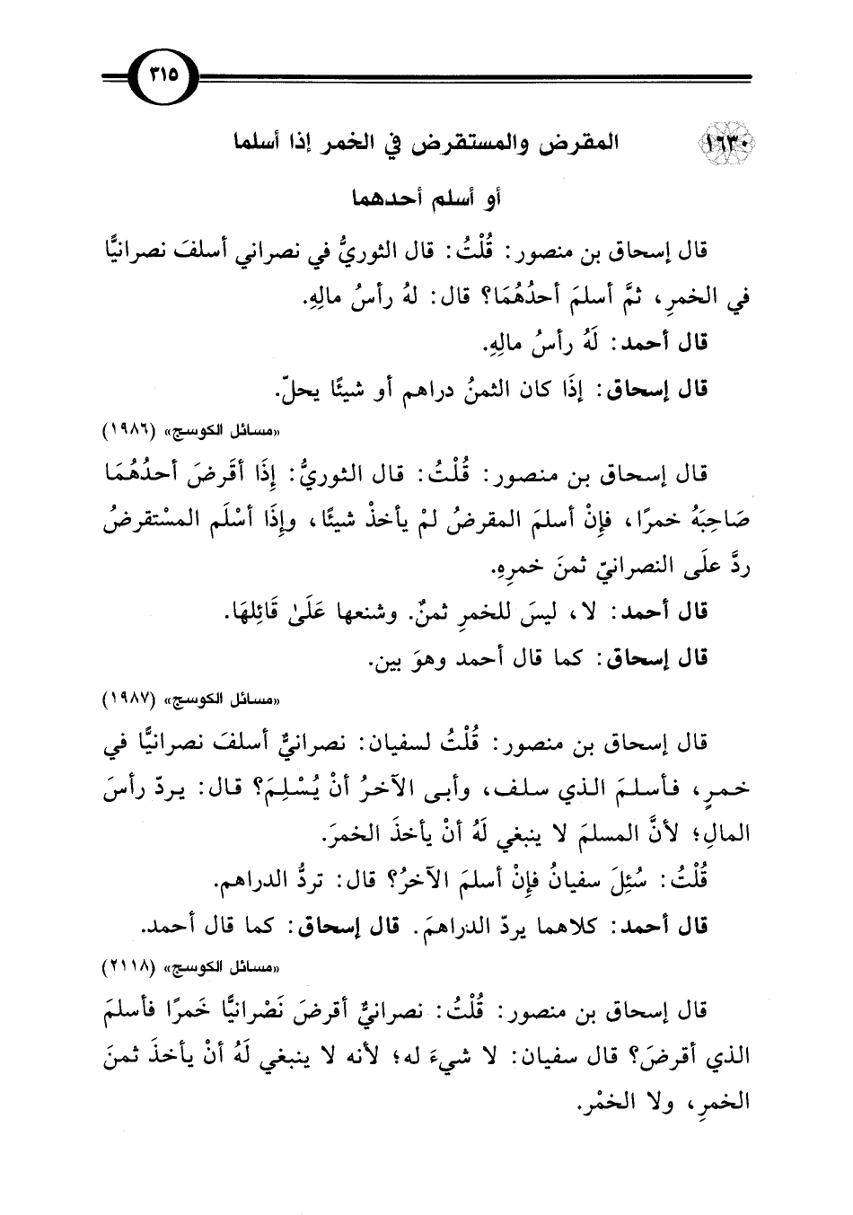 قال إسحاق بن منصور: قُلْتُ: قال الثوريُّ في نصراني أسلفَ نصرانيًّا في الخمرِ، ثمَّ أسلمَ أحدُهُمَا؟ قال: لهُ رأسُ مالِهِ.