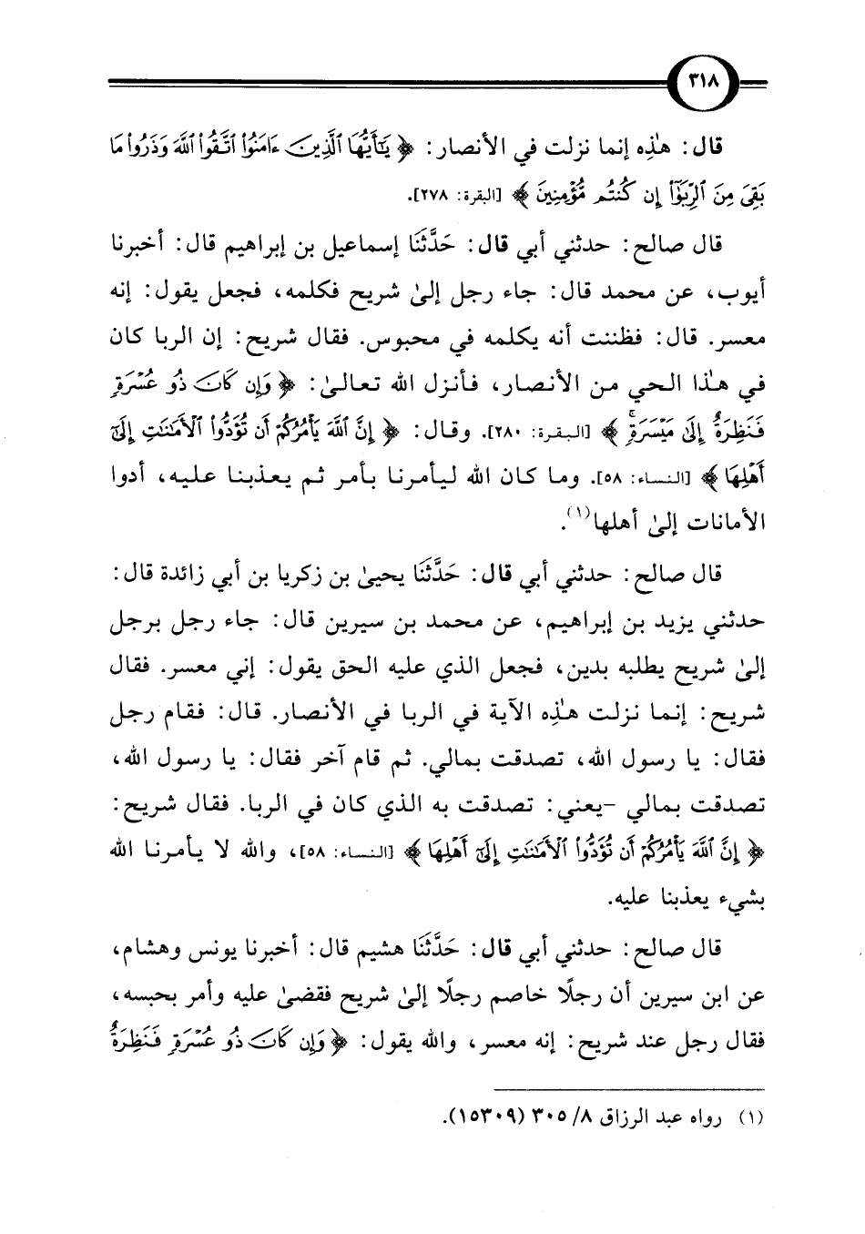 قال صالح: حدثني أبي قال: حَدَّثنَا يحيى بن زكريا بن أبي زائدة قال: حدثني يزيد بن إبراهيم، عن محمد بن سيرين قال: جاء رجل برجل إلى شريح يطلبه بدين، فجعل الذي عليه الحق يقول: إني معسر. فقال شريح: إنما نزلت هذِه الآية في الربا في الأنصار. قال: فقام رجل فقال: يا رسول اللَّه، تصدقت بمالي. ثم قام آخر فقال: يا رسول اللَّه، تصدقت بمالي -يعني: تصدقت به الذي كان في الربا. فقال شريح: {إِنَّ اللَّهَ يَأْمُرُكُمْ أَنْ تُؤَدُّوا الْأَمَانَاتِ إِلَى أَهْلِهَا} [النساء: 58]، واللَّه لا يأمرنا اللَّه بشيء يعذبنا عليه.