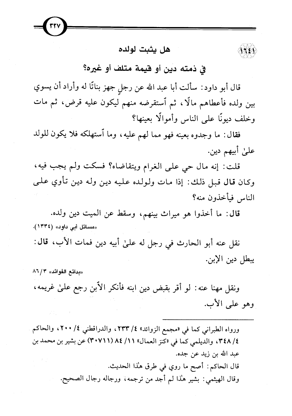 قال أبو داود: سألت أبا عبد اللَّه عن رجلٍ جهز بناتًا له وأراد أن يسوي بين ولده فأعطاهم مالًا، ثم استقرضه منهم ليكون عليه قرض، ثم مات وخلف ديونًا على الناس وأموالًا بعينها؟