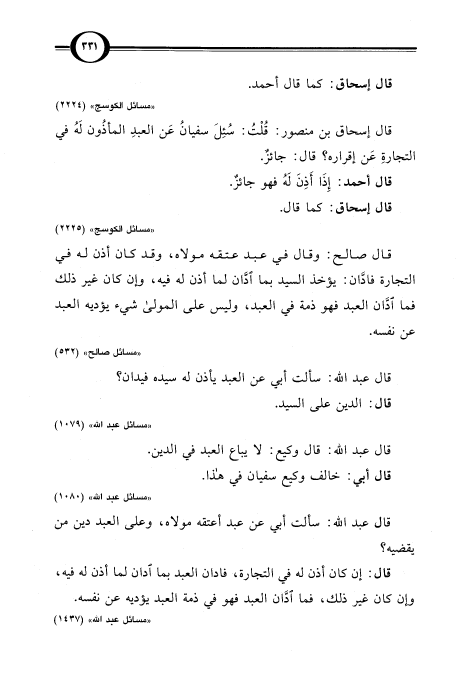 قال إسحاق بن منصور: قُلْتُ: سُئِلَ سفيانُ عَن العبدِ المأذُون لَهُ في التجارة عَن إقراره؟ قال: جائزٌ.