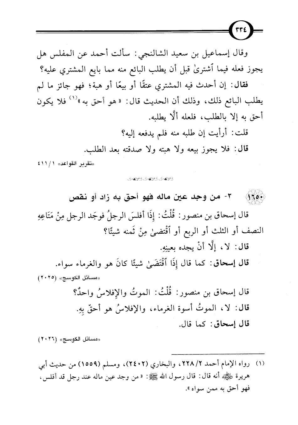 (¬1) رواه الإمام أحمد 2/ 228، والبخاري (2402)، ومسلم (1559) من حديث أبي هريرة رضي اللَّه عنه أنه قال: قال رسول اللَّه -صلى اللَّه عليه وسلم-: "من وجد عين ماله عند رجل قد أفلس، فهو أحق به ممن سواه".