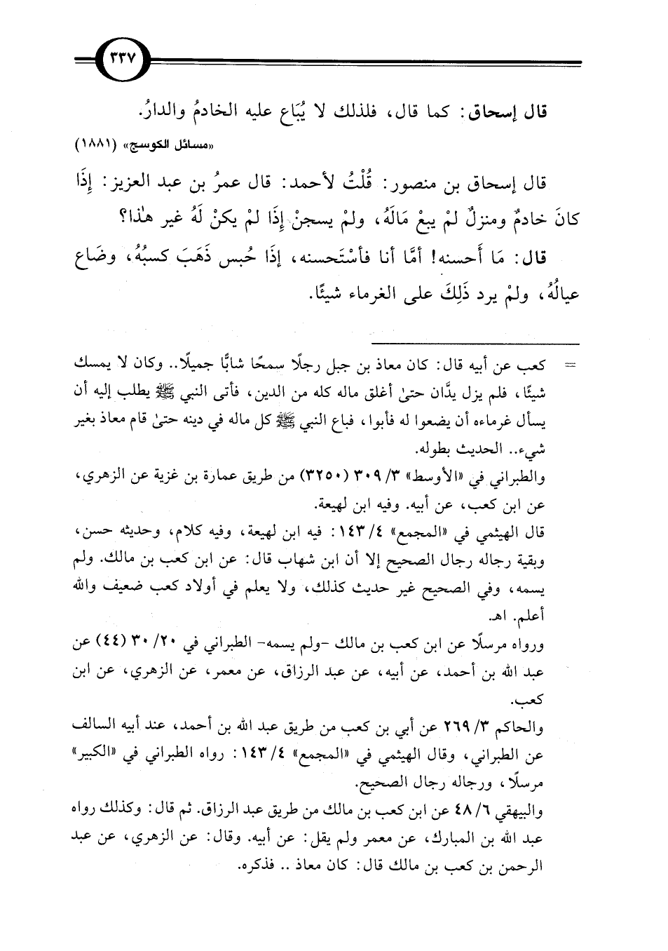 قال إسحاق بن منصور: قُلْتُ لأحمد: قال عمرُ بن عبد العزيز: إِذَا كانَ خادم ومنزلٌ لمْ يبعْ مَالَهُ، ولمْ يسجنْ إِذَا لمْ يكنْ لَهُ غير هذا؟