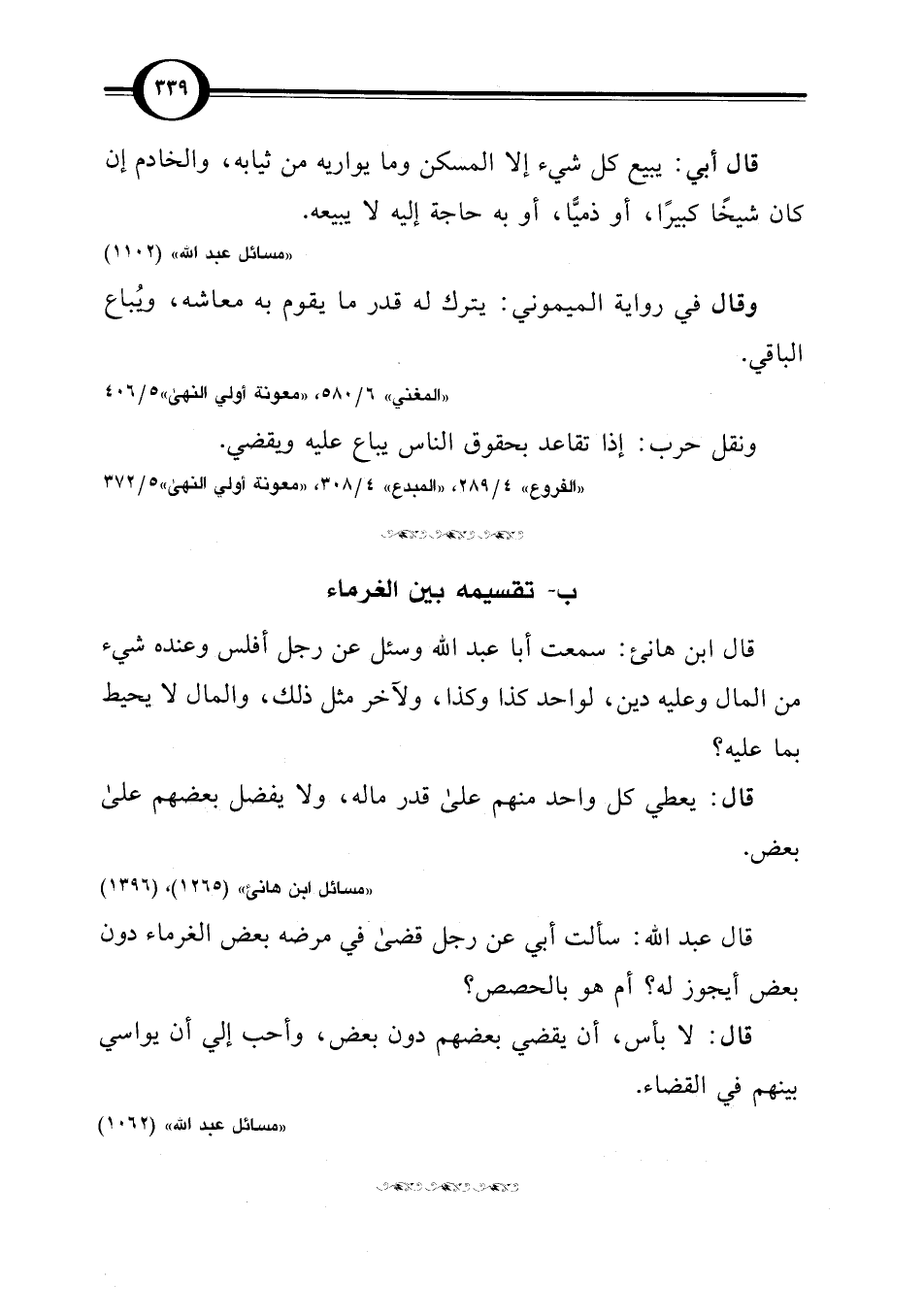 قال عبد اللَّه: سألت أبي عن رجل قضى في مرضه بعض الغرماء دون بعض أيجوز له؟ أم هو بالحصص؟