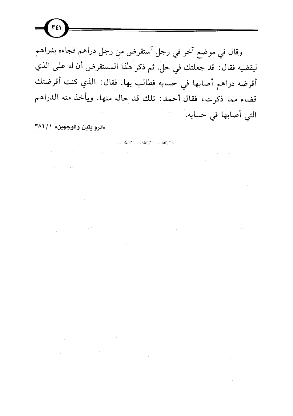 وقال في موضع آخر في رجل استقرض من رجل دراهم فجاءه بدراهم ليقضيه فقال: قد جعلتك في حل. ثم ذكر هذا المستقرض أن له على الذي أقرضه دراهم أصابها في حسابه فطالب بها. فقال: الذي كنت أقرضتك قضاء مما ذكرت، فقال أحمد: تلك قد حاله منها. ويأخذ منه الدراهم التي أصابها في حسابه.