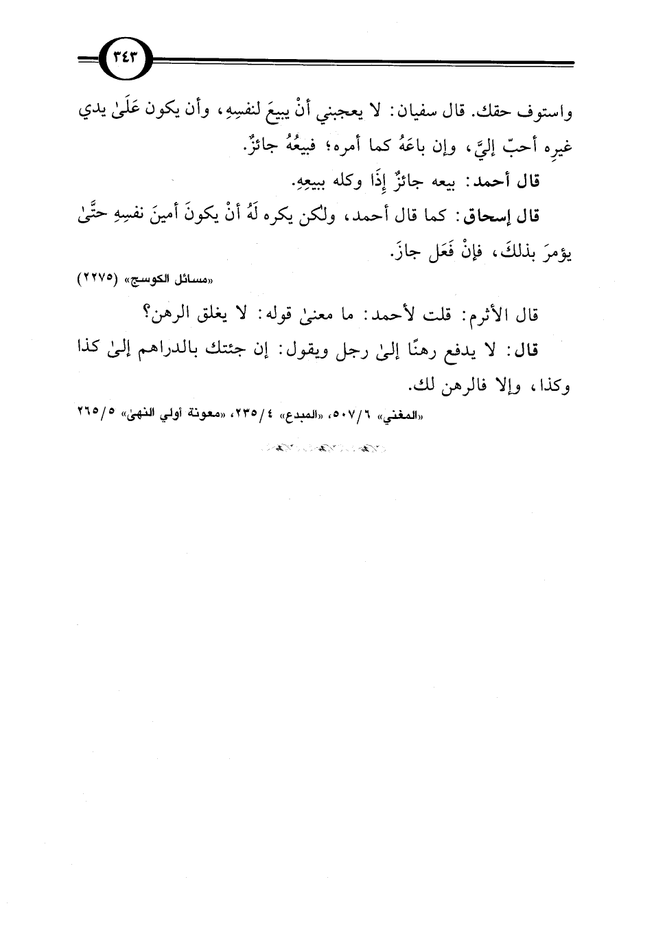 واستوف حقك. قال سفيان: لا يعجبني أنْ يبيعَ لنفسِهِ، وأن يكون عَلَى يدي غيرِه أحبّ إليَّ، ان باعَهُ كما أمره؛ فبيعُهُ جائز.