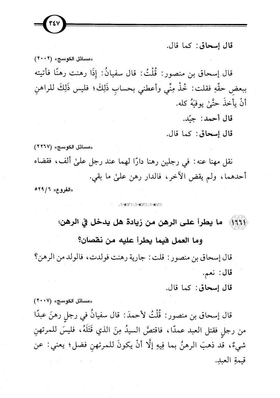 قال إسحاق بن منصور: قُلْتُ: قال سفيانُ: إِذَا رهنت رهنًا فأتيته ببعضِ حقِّهِ فقلت: خُذْ مِنِّي وأعطني بحسابِ ذَلِكَ؛ فليس ذَلِكَ للراهنِ أنْ يأخذَ حتَّى يوفيَهُ كله.