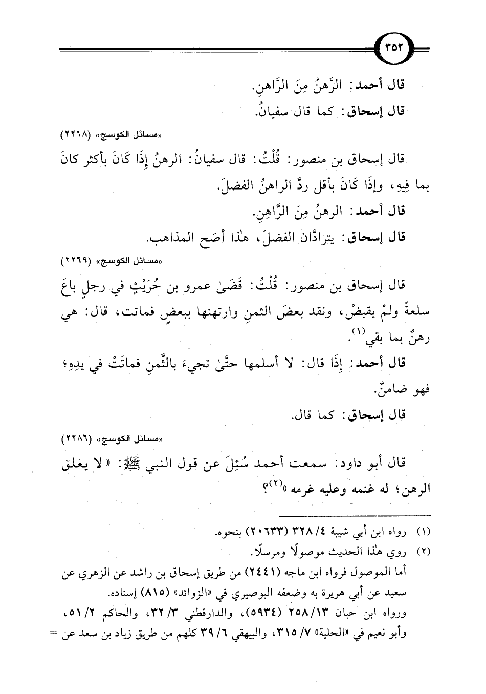 قال أبو داود: سمعت أحمد سُئِلَ عن قول النبي -صلى اللَّه عليه وسلم-: "لا يعلق الرهن؛ له غنمه وعليه غرمه" (¬2)؟