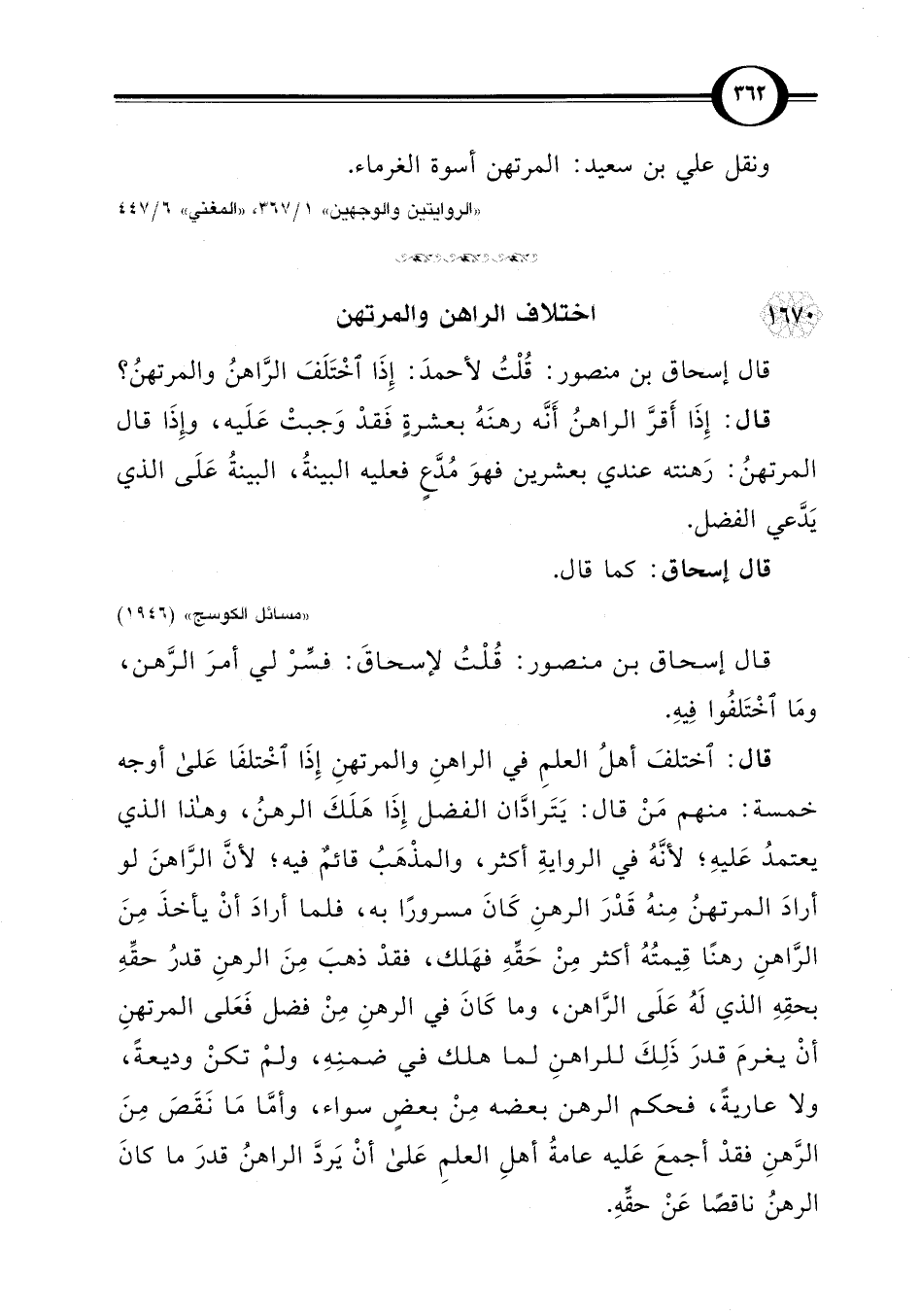قال إسحاق بن منصور: قُلْتُ لإسحاقَ: فسِّرْ لي أمرَ الرَّهن، ومَا اخْتَلفُوا فِيهِ.