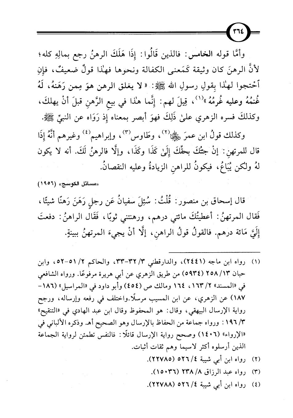 وأمَّا قوله الخامس: فالذين قَالُوا: إِذَا هَلَكَ الرهنُ رجع بمالِهِ كله؛ لأنَّ الرهنَ كان وثيقة كَمَعنى الكفالة ونحوها فهذا قولٌ ضعيفٌ، فإِنِ احْتجوا لهذا بِقولِ رسولِ اللَّه -صلى اللَّه عليه وسلم-: "لا يغلق الرهن هوَ مِمن رَهَنهُ، لَهُ غُنمُهُ وعليه غُرمُهُ" (¬1)، قِيلَ لهم: إِنَّما هذا في بيعِ الرَّهنِ قبلَ أنْ يهلكَ، وكذلكَ فسره الزهري على ذَلِكَ فهوَ أبصر بمعناه إِذ رَوَاه عن النبيِّ -صلى اللَّه عليه وسلم-.