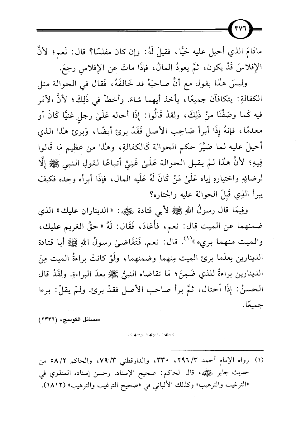 وفِيمَا قال رسول اللَّهِ -صلى اللَّه عليه وسلم- لأبي قتادة رضي اللَّه عنه: "الديناران عليك" الذي ضمنهما عن الميت قال: نعم، فأَعَادَ، فَقَال: لَهُ "حقُّ الغريم عليك، والميت منهما بريء" (¬1). قال: نعم. فَتَقَاضى رسول اللَّهِ -صلى اللَّه عليه وسلم- أبا قتادة الدينارين بعدَما برئ الميت مِنهما وضمنهما، ولَوْ كانتْ براءةُ الميت مِنَ الدينارين براءةً للذي ضَمِنَ؛ مَا تقاضاه النبيُّ -صلى اللَّه عليه وسلم- بعدَ البراءةِ. ولقَدْ قال الحسنُ: إِذَا احتال، ثمَّ برأ صاحب الأصل فقدْ برئ. ولمْ يقلْ: برءا جميعًا.