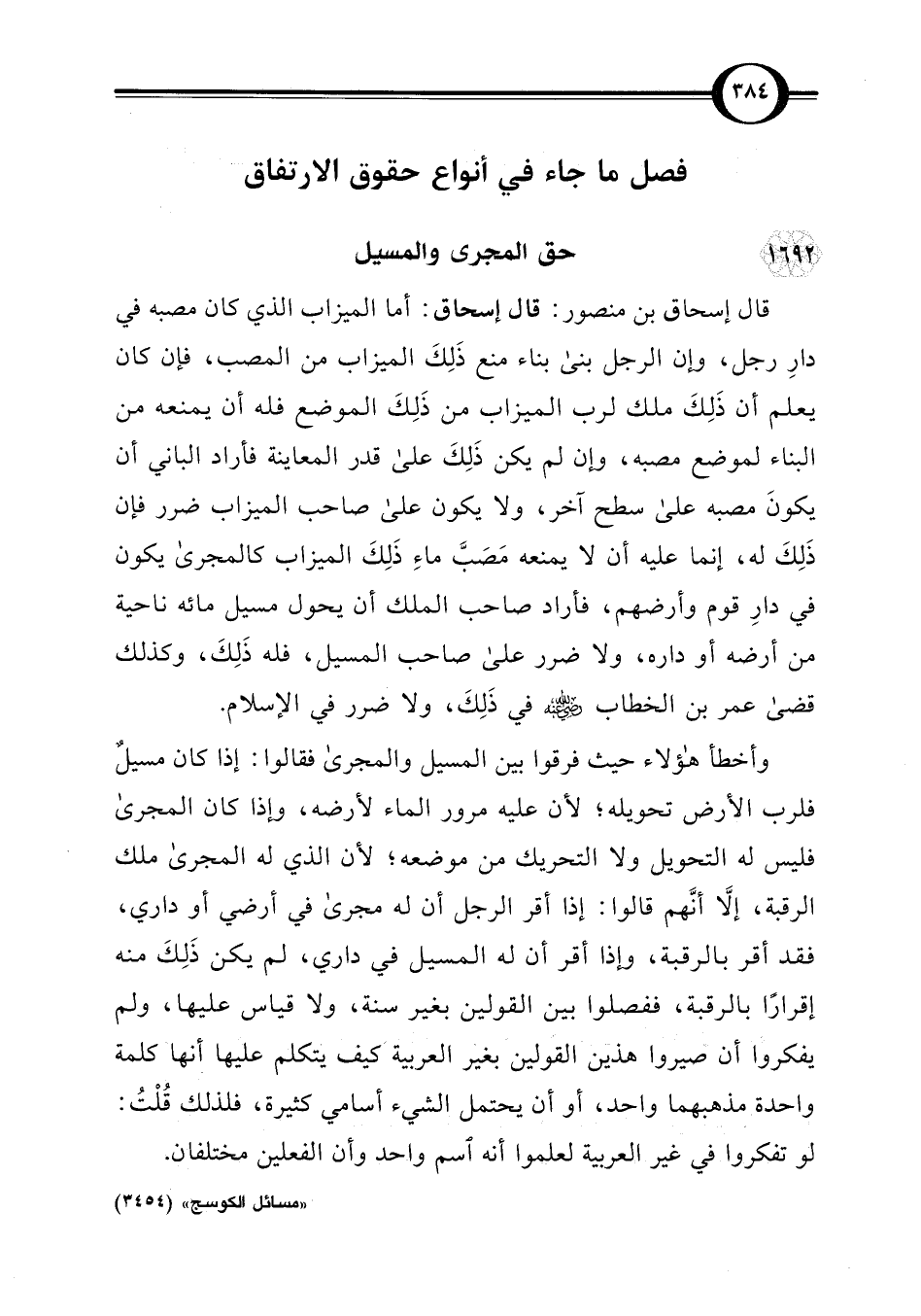 قال إسحاق بن منصور: قال إسحاق: أما الميزاب الذي كان مصبه في دارِ رجل، وإن الرجل بنى بناء منع ذَلِكَ الميزاب من المصب، فإن كان يعلم أن ذَلِكَ ملك لرب الميزاب من ذَلِكَ الموضع فله أن يمنعه من البناء لموضع مصبه، وإن لم يكن ذَلِكَ على قدر المعاينة فأراد الباني أن يكونَ مصبه على سطح آخر، ولا يكون على صاحب الميزاب ضرر فإن ذَلِكَ له، إنما عليه أن لا يمنعه مَصَبَّ ماءِ ذَلِكَ الميزاب كالمجرى يكون في دارِ قوم وأرضهم، فأراد صاحب الملك أن يحول مسيل مائه ناحية من أرضه أو داره، ولا ضرر على صاحب المسيل، فله ذَلِكَ، وكذلك قضى عمر بن الخطاب -رضي اللَّه عنه- في ذَلِكَ، ولا ضرر في الإسلام.