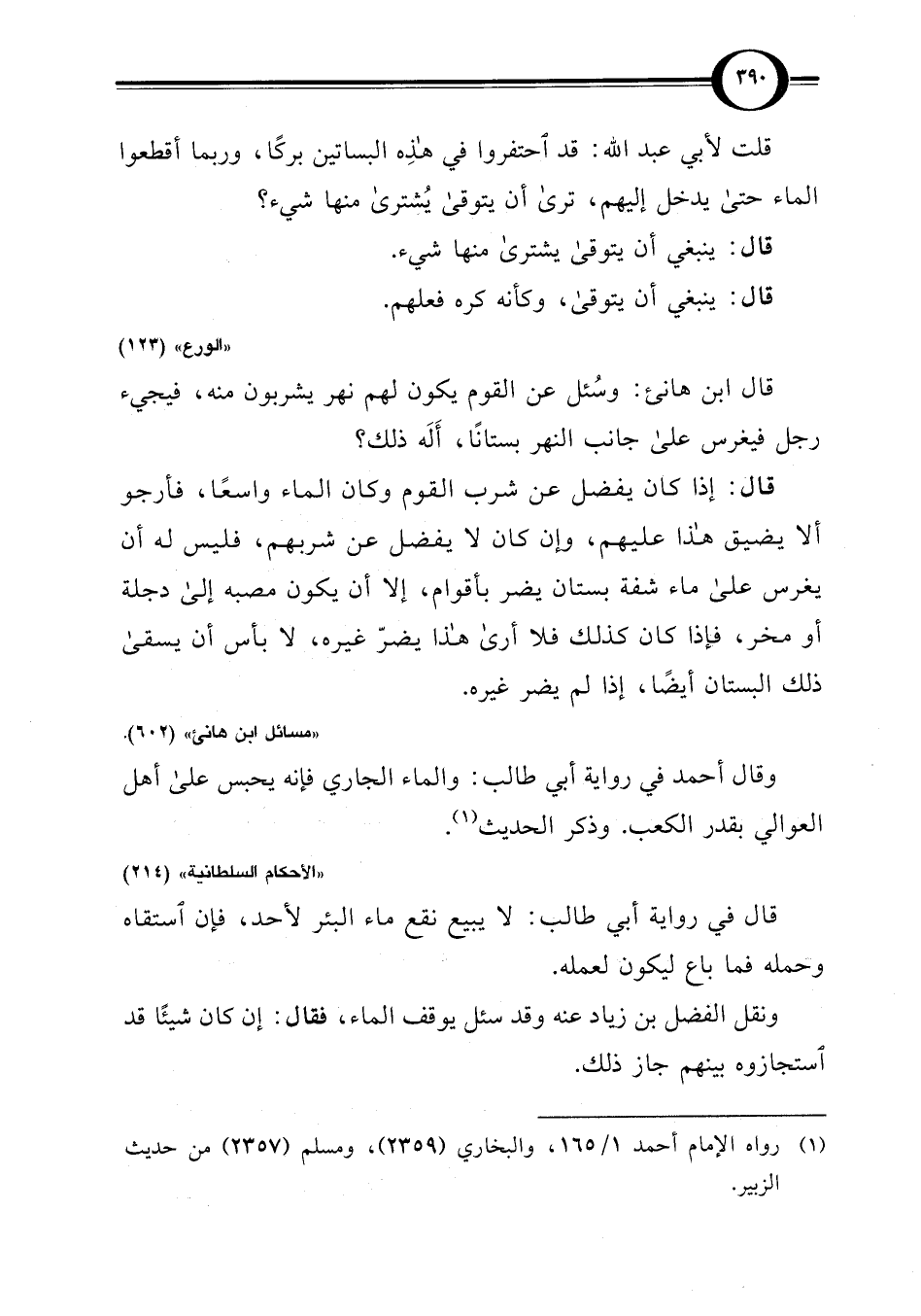 ونفل الفضل بن زياد عنه وقد سئل يوقف الماء، فقال: إن كان شيئًا قد استجازوه بينهم جاز ذلك.