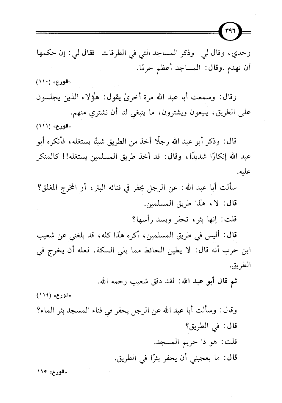قال: وذكر أبو عبد اللَّه رجلًا أخذ من الطريق شيئًا يستغله، فأنكره أبو عبد اللَّه إنكارًا شديدًا، وقال: قد أخذ طريق المسلمين يستغله! ! كالمنكر عليه.