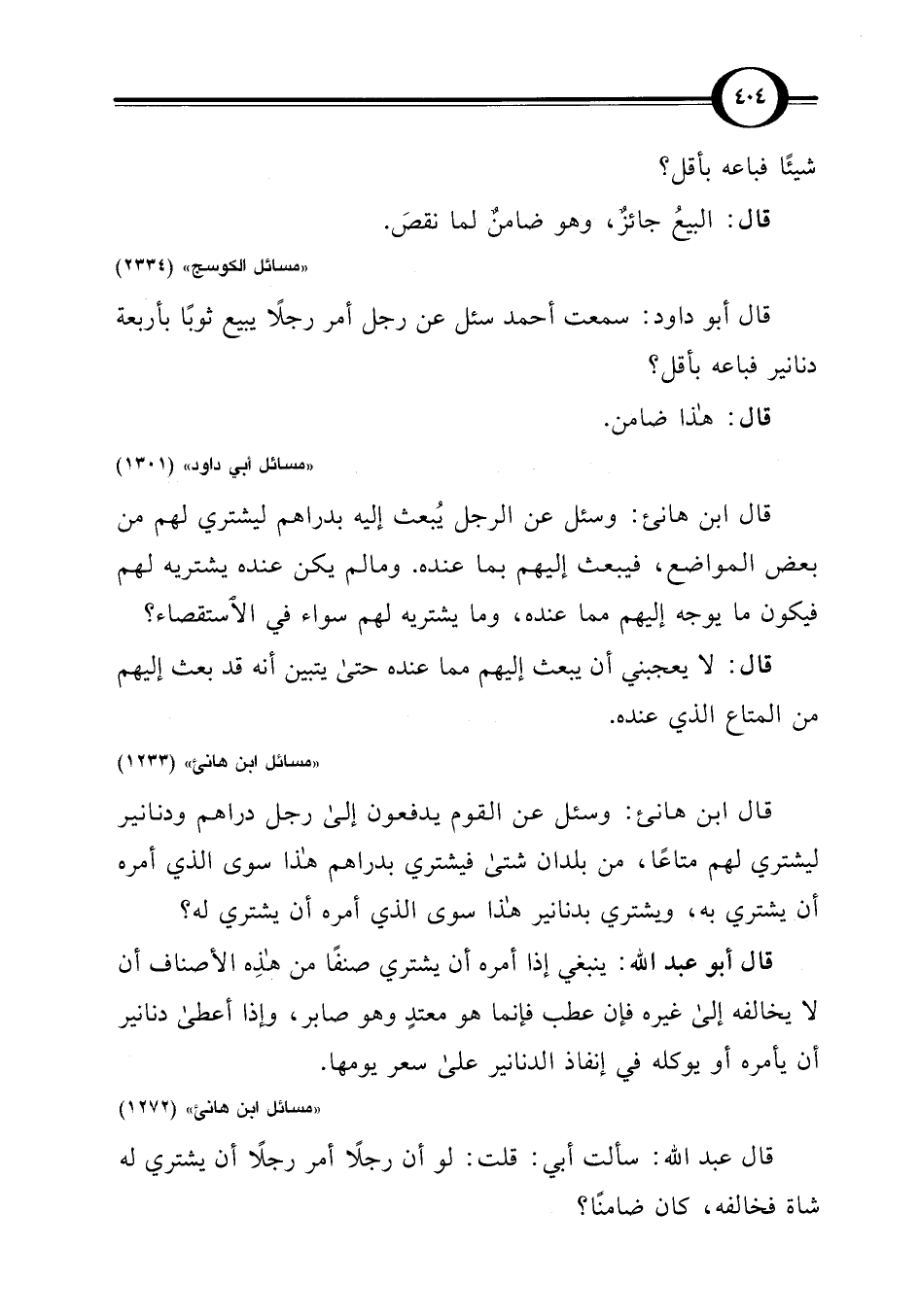 قال ابن هانئ: وسئل عن الرجل يُبعث إليه بدراهم ليشتري لهم من بعض المواضع، فيبعث إليهم بما عنده. وما لم يكن عنده يشتريه لهم فيكون ما يوجه إليهم مما عنده، وما يشتريه لهم سواء في الاستقصاء؟