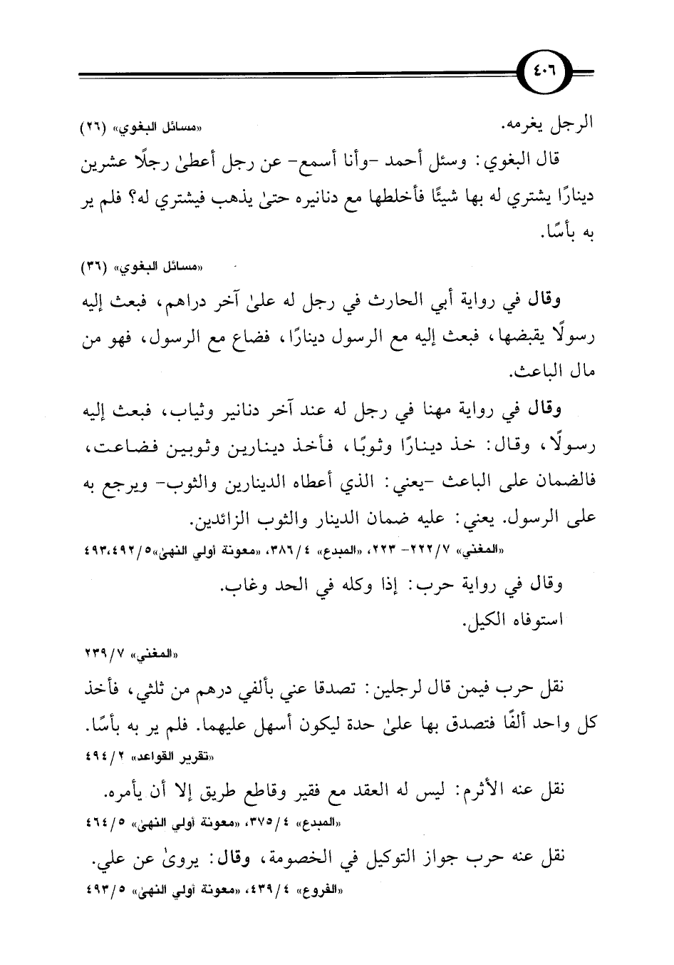 وقال في رواية مهنا في رجل له عند آخر دنانير وثياب، فبعث إليه رسولًا، وقال: خذ دينارًا وثوبًا، فأخذ دينارين وثوبين فضاعت، فالضمان على الباعث -يعني: الذي أعطاه الدينارين والثوب- ويرجع به على الرسول. يعني: عليه ضمان الدينار والثوب الزائدين.