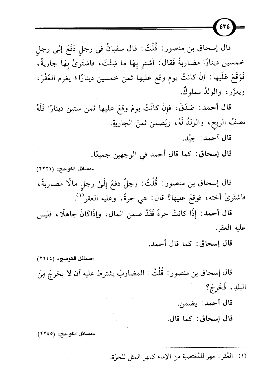 قال إسحاق بن منصور: قُلْتُ: قال سفيانُ في رجلٍ دَفَعَ إلى رجلٍ خمسين دينارًا مضاربةً فَقال: اشترِ بِهَا ما شِئْتَ، فاشتَرى بِهَا جاريةً، فَوَقَعَ عَلَيها: إنْ كانتْ يوم وقع عليها ثمن خمسين دينارًا؛ يغرم العُقْرَ، ويعزّر، والولدُ مملوكٌ.