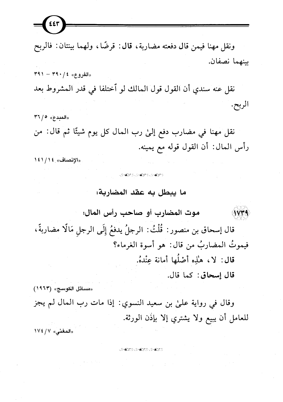 قال إسحاق بن منصور: قُلْتُ: الرجلُ يدفعُ إِلَى الرجلِ مَالًا مضاربةً، فيموتُ المضاربُ من قال: هو أسوة الغرماء؟