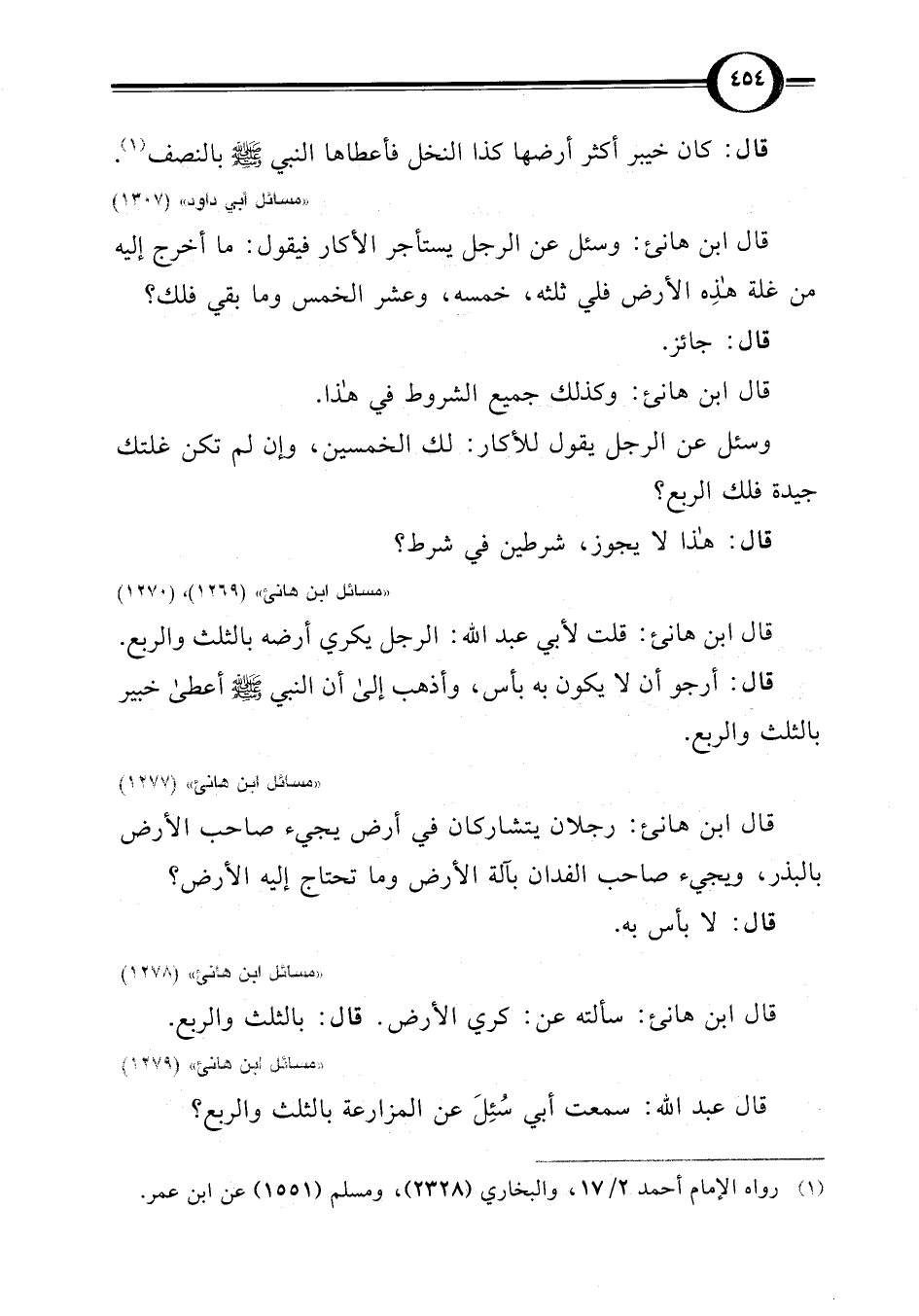 قال ابن هانئ: قلت لأبي عبد اللَّه: الرجل يكري أرضه بالثلث والربع.